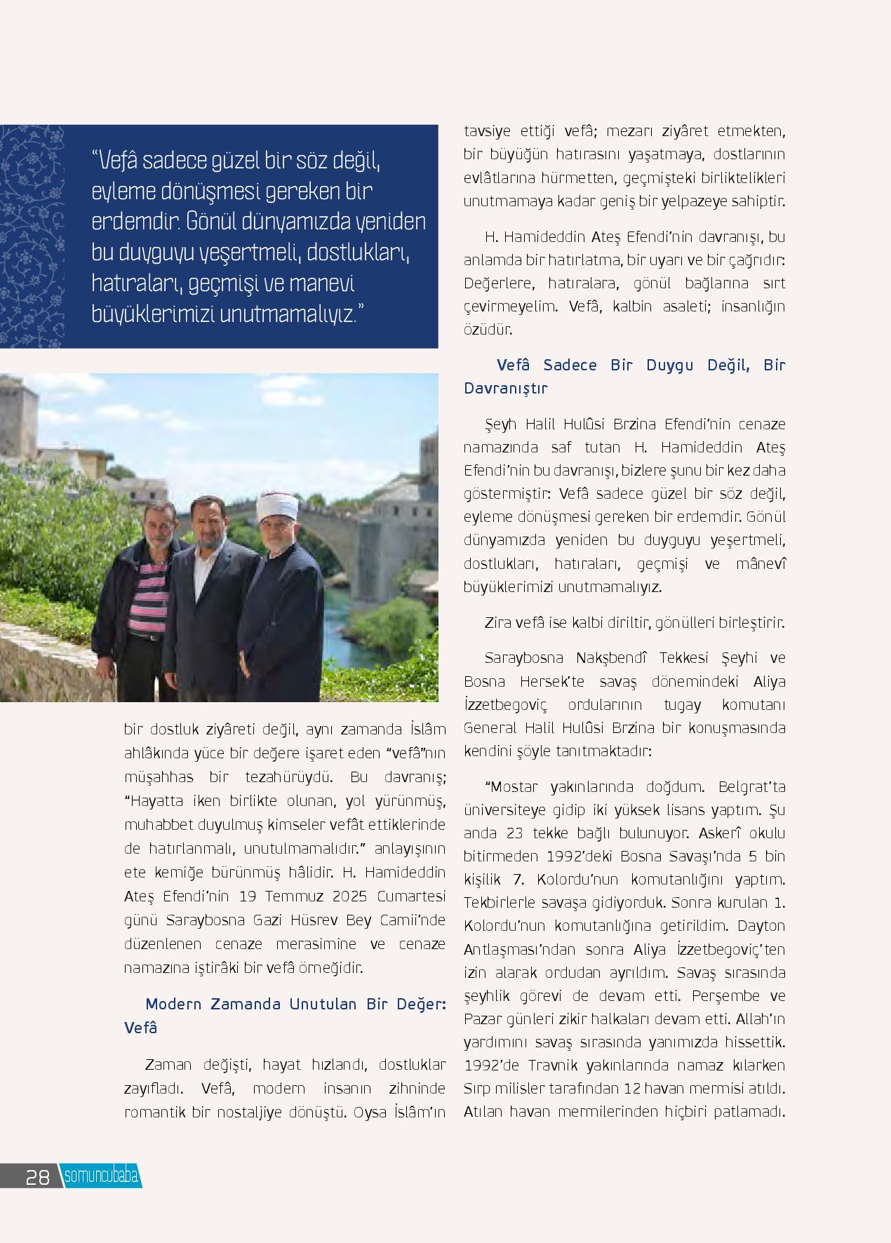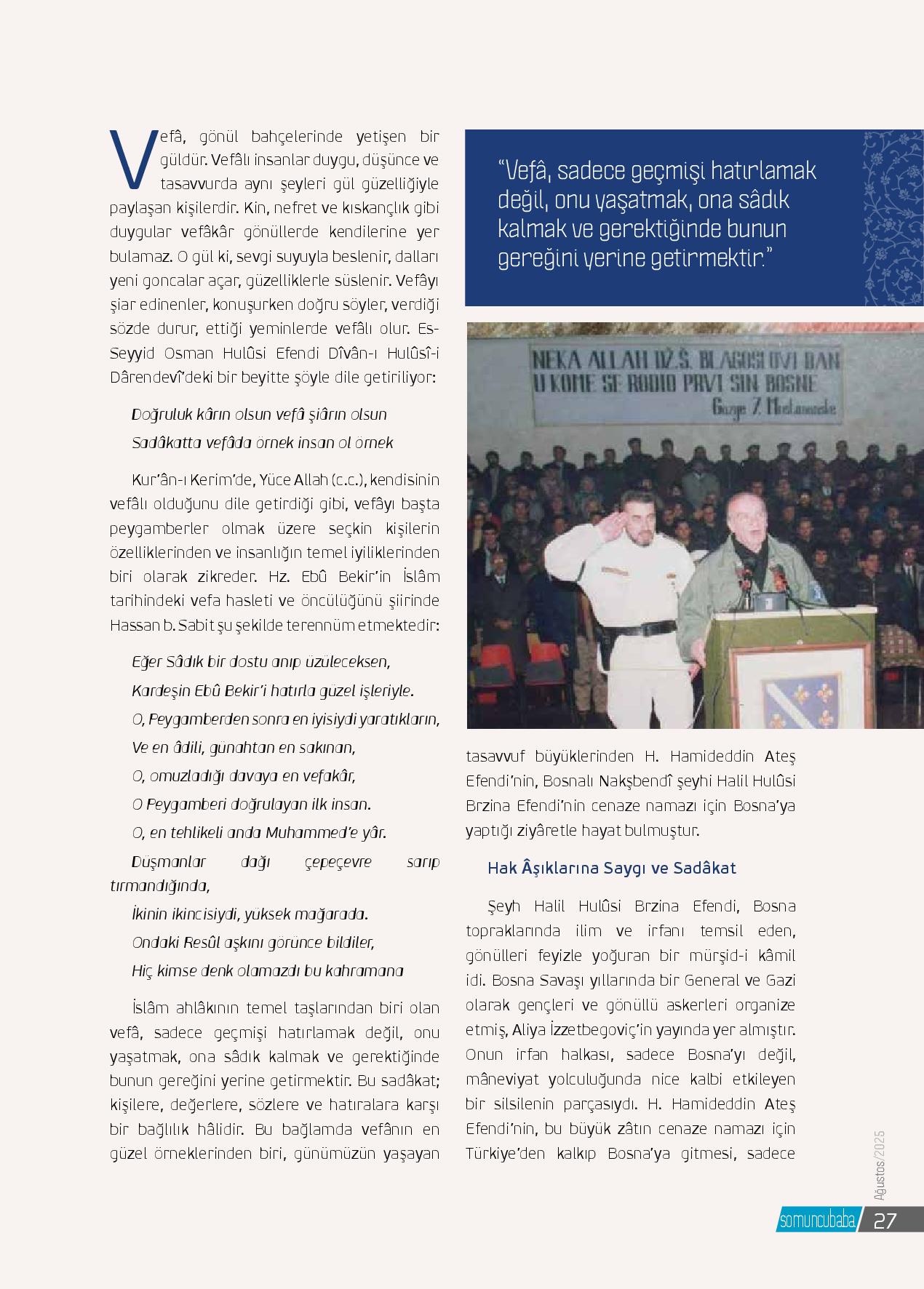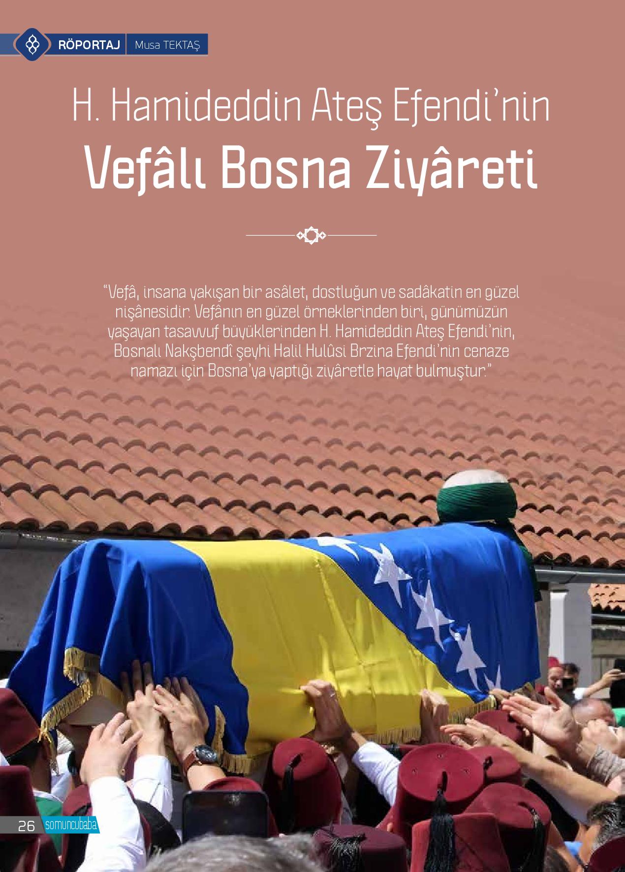 Vefâ Bir İman Şûbesidir: H. Hamideddin Ateş Efendi’nin Vefâlı Bosna Ziyâreti “Vefâ, insana yakışan bir asâlet, dostluğun ve sadâkatin en güzel nişânesidir.” Vefâ, gönül bahçelerinde yetişen bir güldür. Vefâlı insanlar duygu, düşünce ve tasavvurda aynı şeyleri gül güzelliğiy...