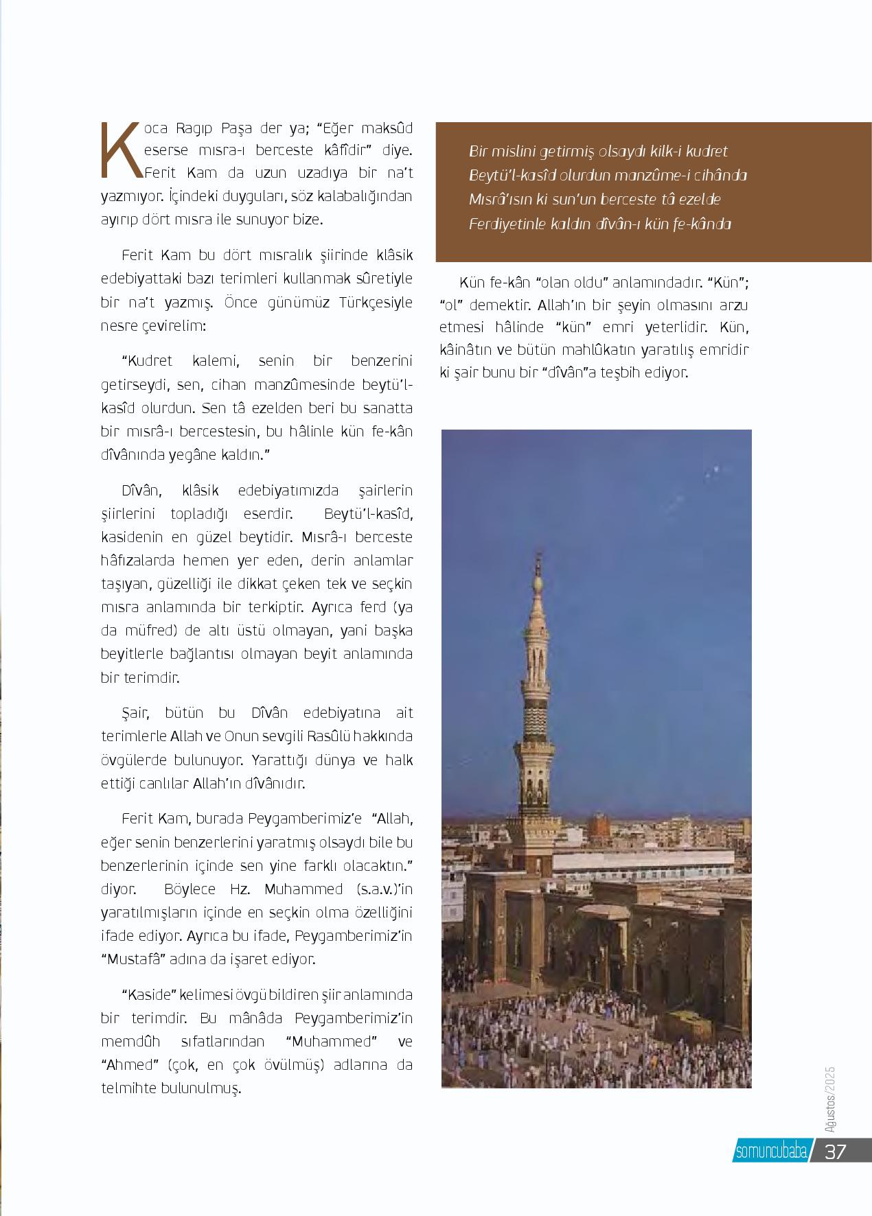 Ferit Kam (1864-1944)Bir mislini getirmiş olsaydı kilk-i kudretBeytü’l-kasîd olurdun manzûme-i cihândaMısrâ’ısın ki sun’un berceste tâ ezeldeFerdiyetinle kaldın dîvân-ı kün fe-kânda Koca Ragıp Paşa der ya; “Eğer maksûd eserse mısra-ı berceste kâfîdir” diye. Ferit Kam ...