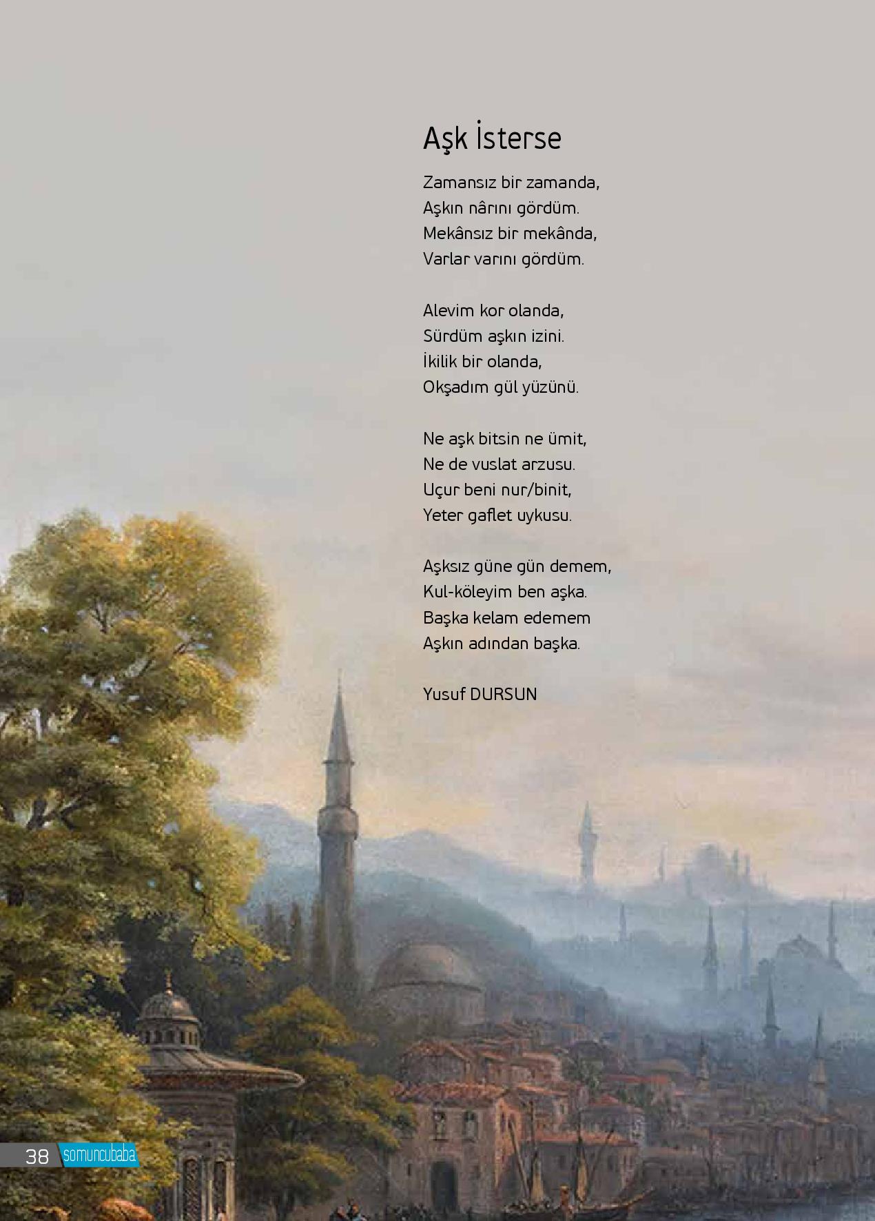 Zamansız bir zamanda,Aşkın nârını gördüm.Mekânsız bir mekânda,Varlar varını gördüm.Alevim kor olanda,Sürdüm aşkın izini.İkilik bir olanda,Okşadım gül yüzünü.Ne aşk bitsin ne ümit,Ne de vuslat arzusu.Uçur beni nur/binit,Yeter gaflet uykusu.Aşksız güne gün demem,Kul-köleyim ben aşka.Başka k...