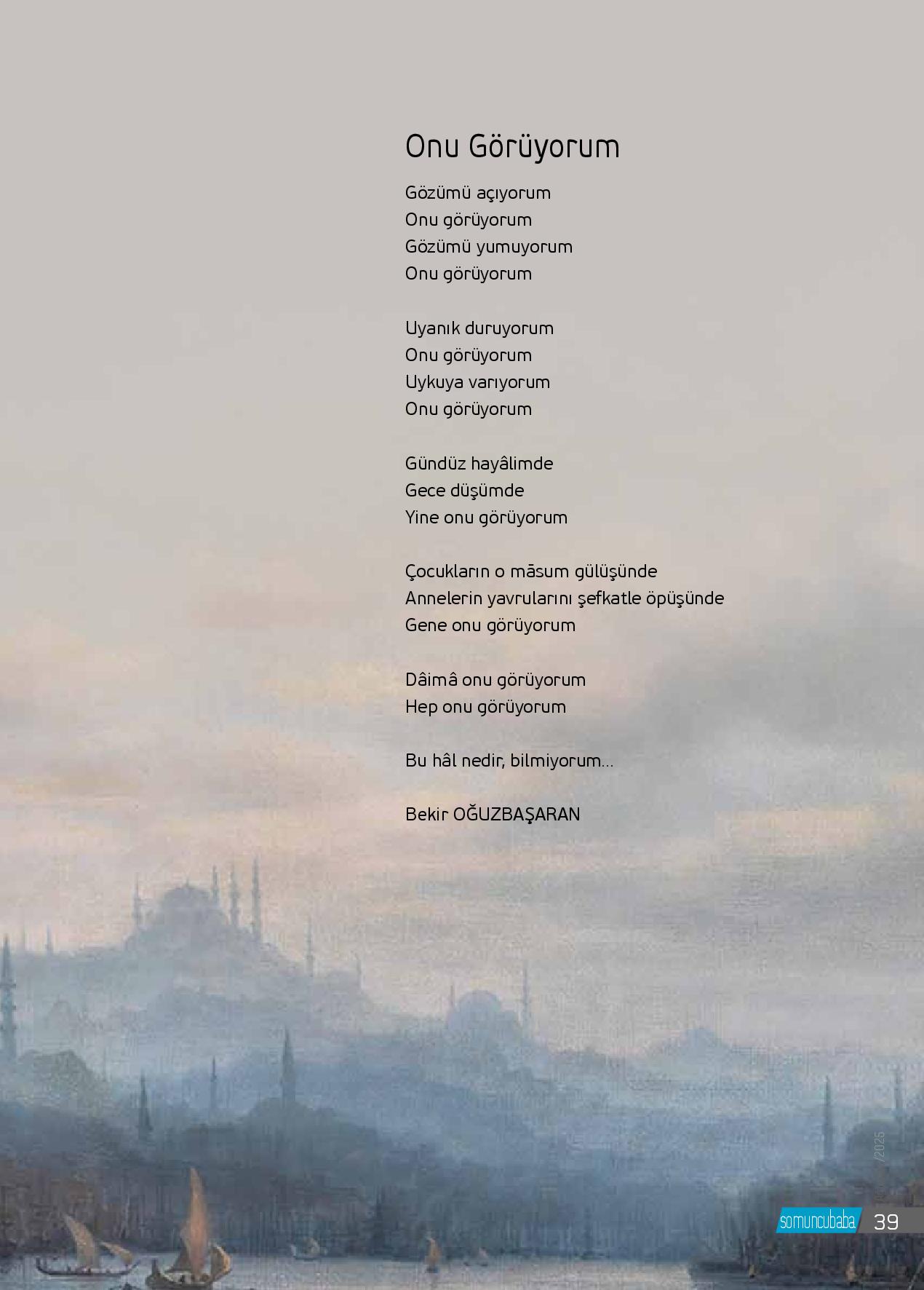 Gözümü açıyorumOnu görüyorumGözümü yumuyorumOnu görüyorumUyanık duruyorumOnu görüyorumUykuya varıyorumOnu görüyorumGündüz hayâlimdeGece düşümdeYine onu görüyorumÇocukların o māsum gülüşündeAnnelerin yavrularını şefkatle öpüşündeGene onu görüyorumDâimâ onu görüyorumHep onu görüyorumBu hâ...
