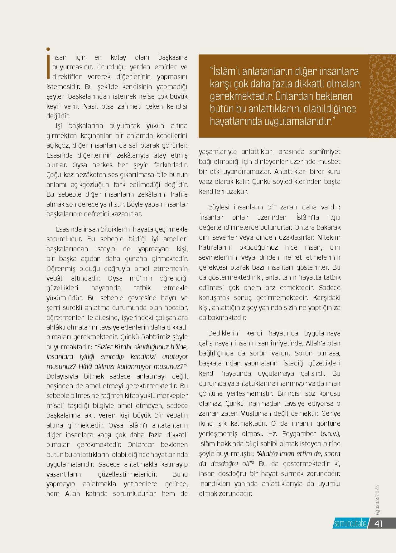 İnsan için en kolay olanı başkasına buyurmasıdır. Oturduğu yerden emirler ve direktifler vererek diğerlerinin yapmasını istemesidir. Bu şekilde kendisinin yapmadığı şeyleri başkalarından istemek nefse çok büyük keyif verir. Nasıl olsa zahmeti çeken kendisi değildir.İşi başkal...