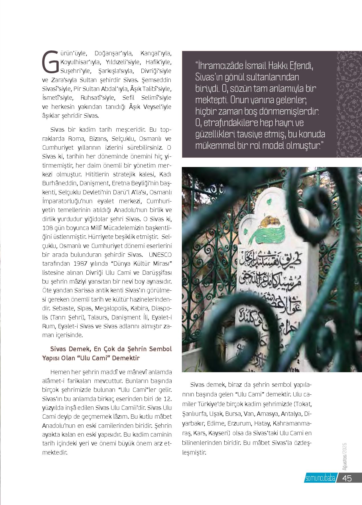 Gürün'üyle, Doğanşar'ıyla, Kangal'ıyla, Koyulhisar'ıyla, Yıldızeli'siyle, Hafik'iyle, Suşehri'yle, Şarkışla'sıyla, Divriği'siyle ve Zara'sıyla Sultan şehirdir Sivas. Şemseddin Sivasî'siyle, Pir Sultan Abdal'ıyla, Âşık Talibî'siyle, İs...