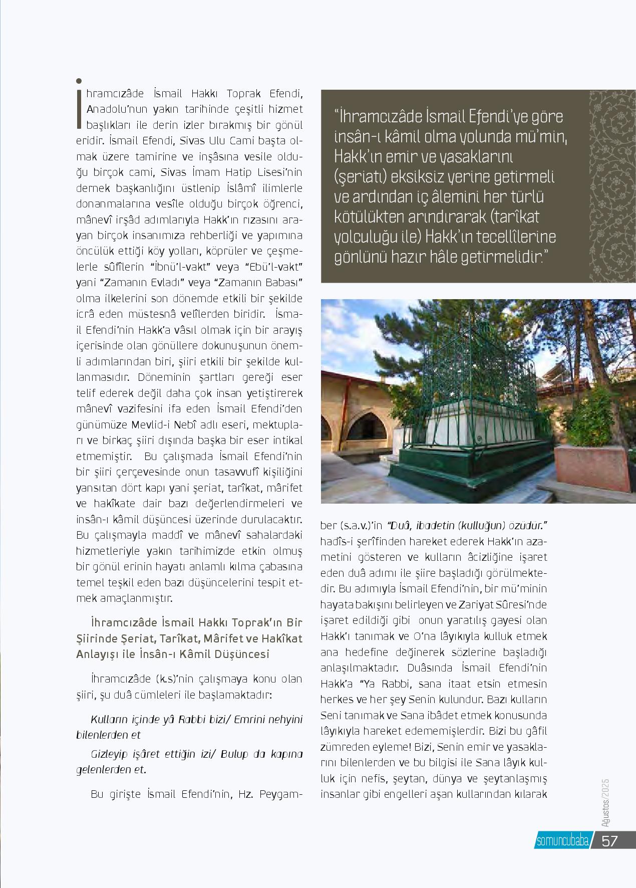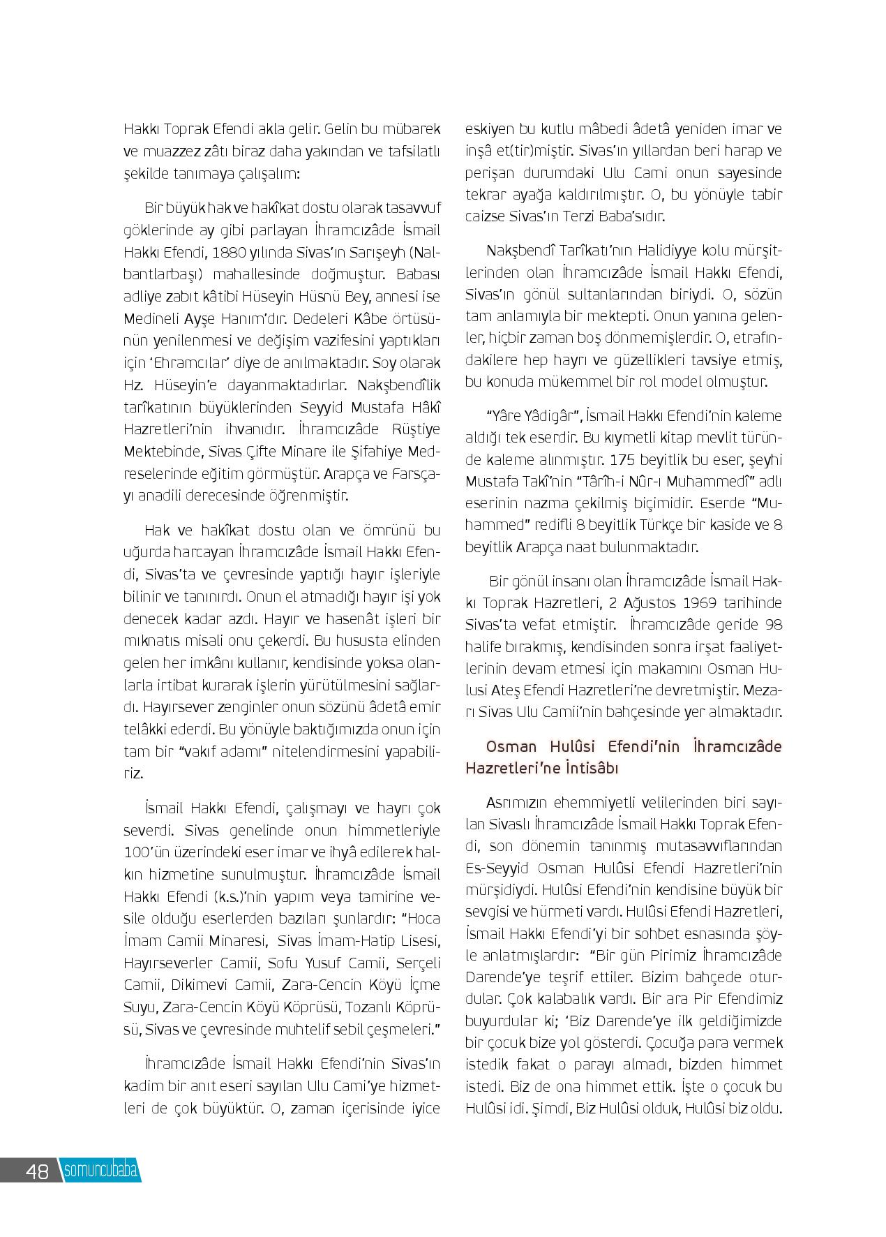 İhramcızâde İsmail Hakkı Toprak Efendi, Anadolu’nun yakın tarihinde çeşitli hizmet başlıkları ile derin izler bırakmış bir gönül eridir. İsmail Efendi, Sivas Ulu Cami başta olmak üzere tamirine ve inşâsına vesile olduğu birçok cami, Sivas İmam...