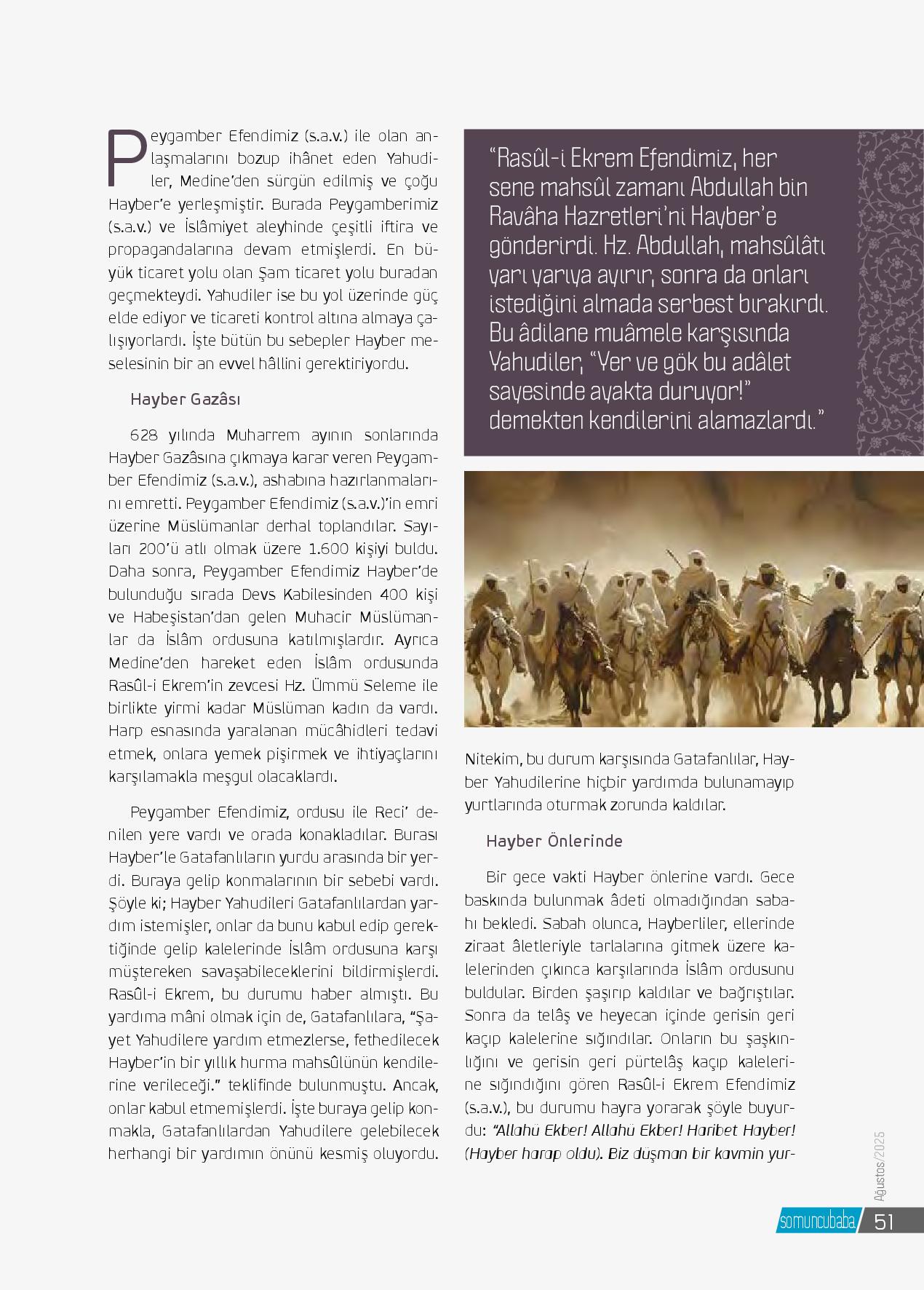 Peygamber Efendimiz (s.a.v.) ile olan anlaşmalarını bozup ihânet eden Yahudiler, Medine'den sürgün edilmiş ve çoğu Hayber’e yerleşmiştir. Burada Peygamberimiz (s.a.v.) ve İslâmiyet aleyhinde çeşidi iftira ve propagandalarına devam etmişlerdi. En büyük ticaret y...