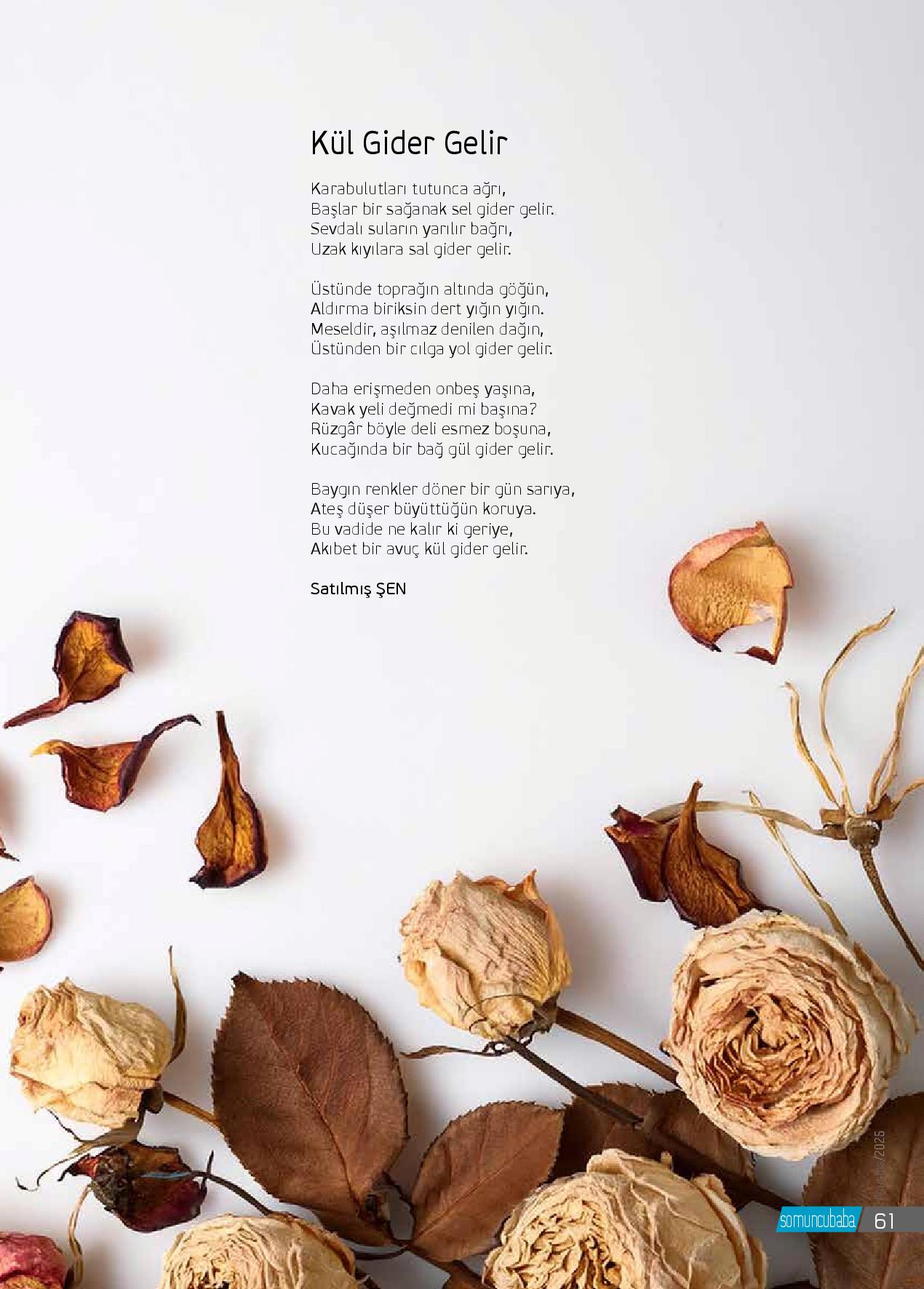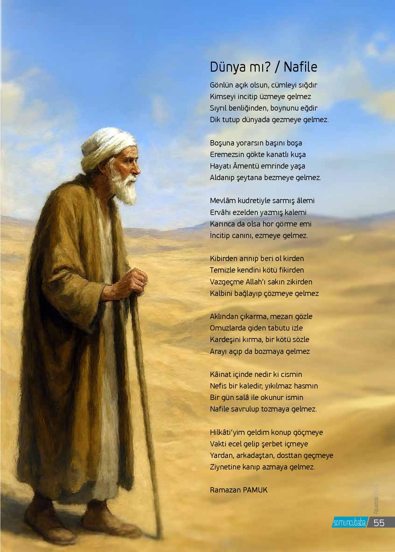 Gönlün açık olsun, cümleyi sığdırKimseyi incitip üzmeye gelmezSıyrıl benliğinden, boynunu eğdirDik tutup dünyada gezmeye gelmez.Boşuna yorarsın başını boşaEremezsin gökte kanatlı kuşaHayatı Âmentü emrinde yaşaAldanıp şeytana bezmeye gelmez.Mevlâm kudretiyle sarmış âlemiErvâhı ezelde...