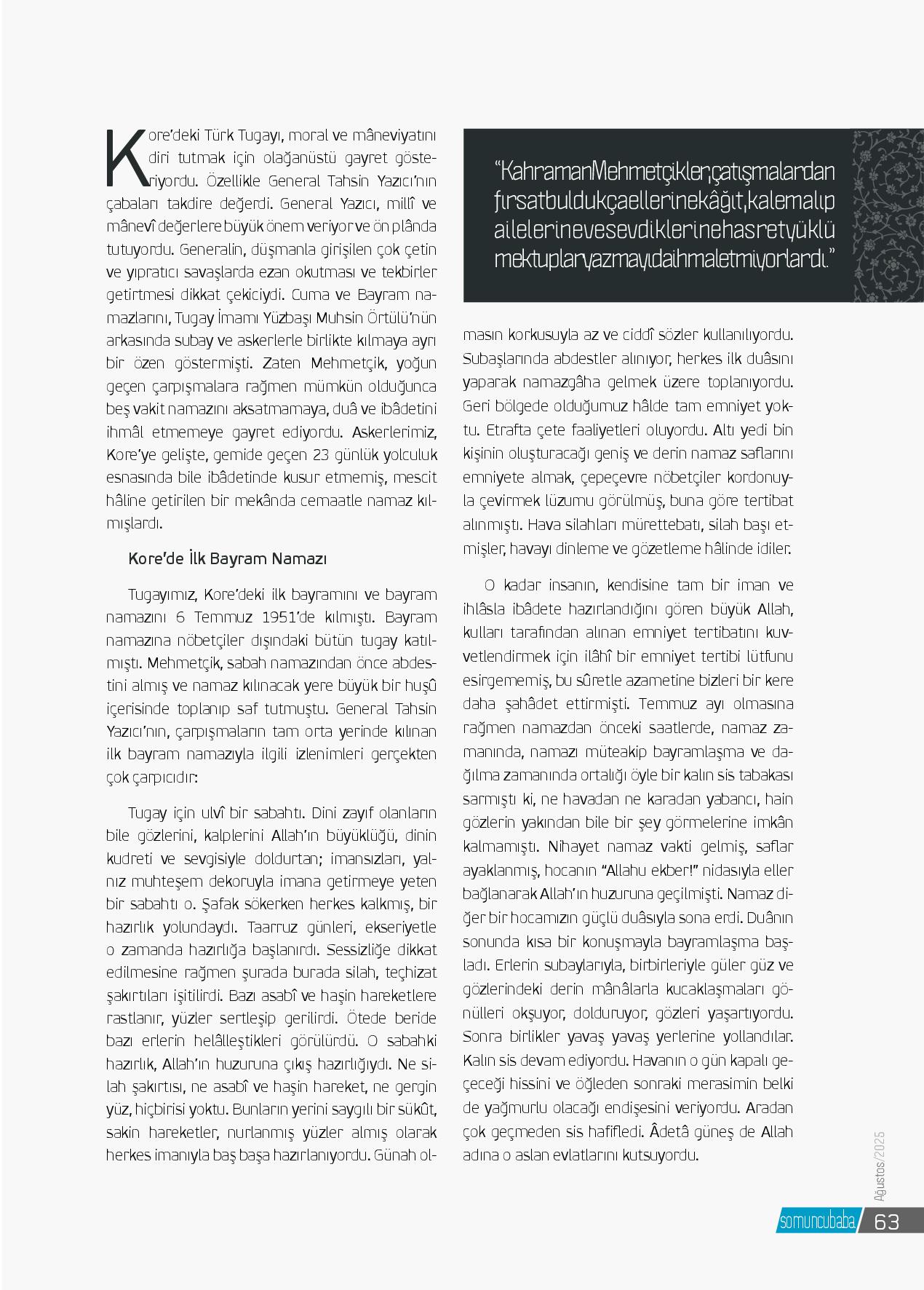 Kore’deki Türk Tugayı, moral ve mâneviyatını diri tutmak için olağanüstü gayret gösteriyordu. Özellikle General Tahsin Yazıcı’nın çabaları takdire değerdi. General Yazıcı, millî ve mânevî değerlere büyük önem veriyor ve ön plânda tutuyordu.Generalin, düşma...