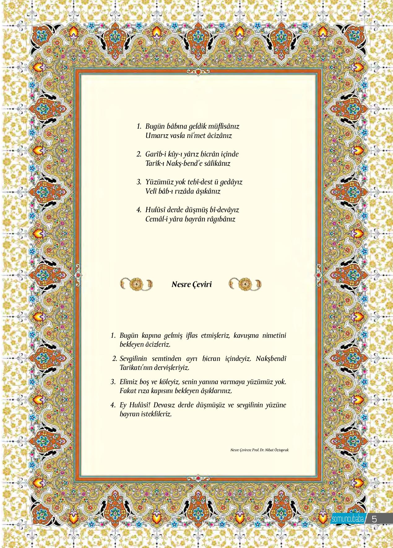 1. Bugün bâbına geldik müflisânızUmarız vasla ni‘met âcizânız2. Garîb-i kûy-ı yârız hicrân içindeTarîk-ı Nakş-bend’e sâlikânız3. Yüzümüz yok tehî-dest ü gedâyızVelî bâb-ı rızâda âşıkânız4. Hulûsî derde düşmüş bî-devâyızCemâl-i yâra hayrân râgıbânızNesre ...