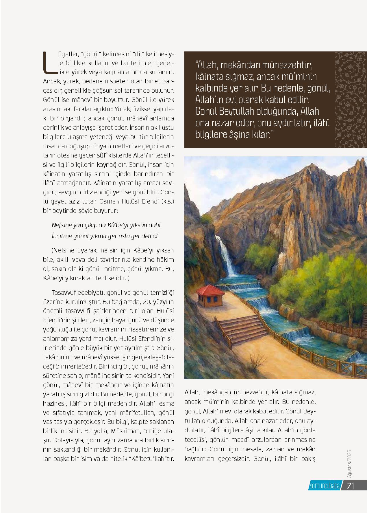 Lügatler, “gönül” kelimesini “dil” kelimesiyle birlikte kullanır ve bu terimler genellikle yürek veya kalp anlamında kullanılır. Ancak, yürek, bedene nispeten olan bir et parçasıdır, genellikle göğsün sol tarafında bulunur. Gönül ise mânevî bir boyuttur. Gönül ile yürek ar...