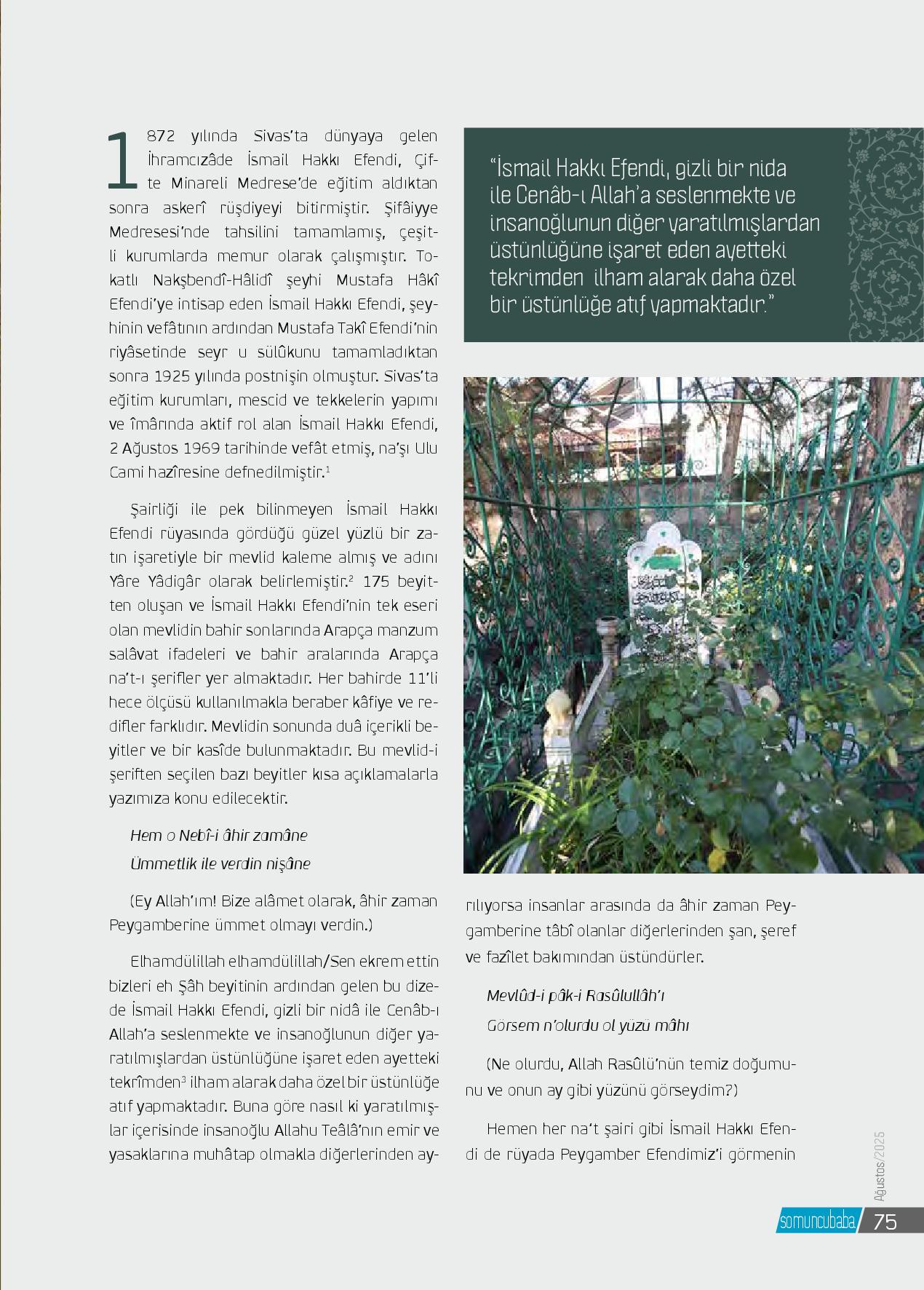 1880 yılında Sivas’ta dünyaya gelen İhramcızâde İsmail Hakkı Efendi, Çifte Minareli Medrese’de eğitim aldıktan sonra askerî rüşdiyeyi bitirmiştir. Şifâiyye Medresesi’nde tahsilini tamamlamış, çeşitli kurumlarda memur olarak çalışmıştır.Tokatlı Nakşbendî-Hâlidî şeyhi Mustafa Hâkî Efendi’y...