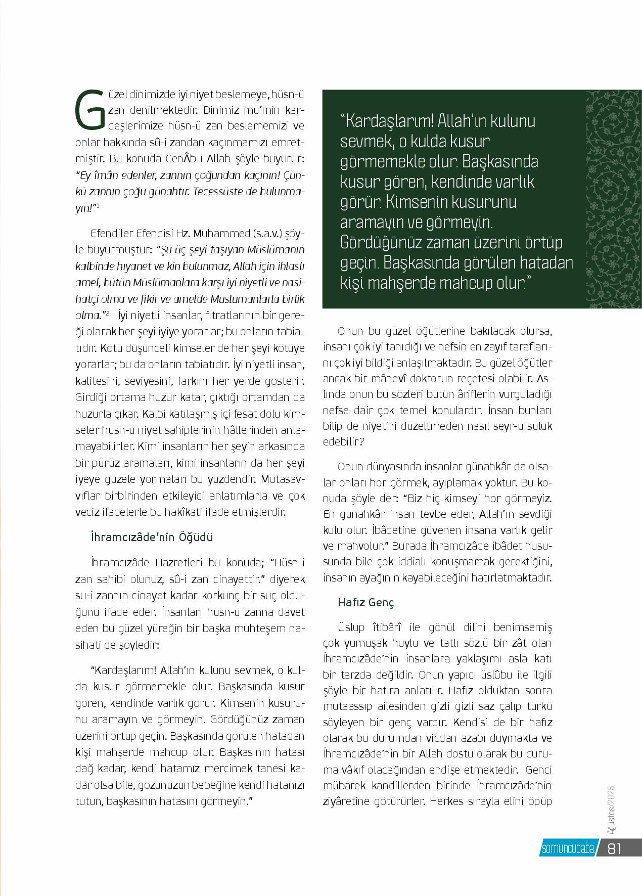 Güzel dinimizde iyi niyet beslemeye, hüsn-ü zan denilmektedir. Dinimiz mü’min kardeşlerimize hüsn-ü zan beslememizi ve onlar hakkında sû-i zandan kaçınmamızı emretmiştir. Bu konuda CenÂb-ı Allah şöyle buyurur: “Ey îmân edenler, zannın çoğundan kaçının! Çünkü zannın çoğu güna...