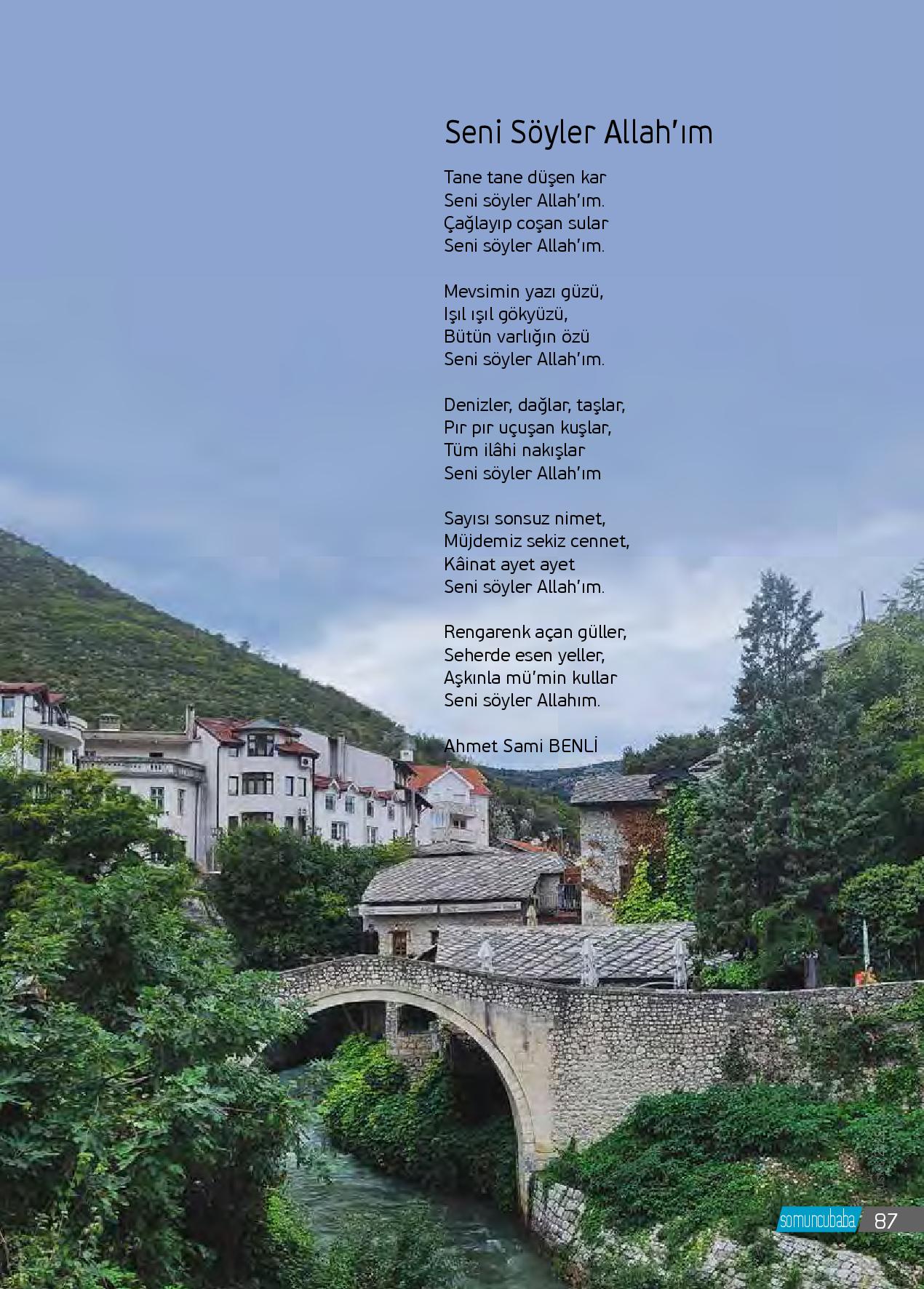 Tane tane düşen karSeni söyler Allah’ım.Çağlayıp coşan sularSeni söyler Allah’ım.Mevsimin yazı güzü,Işıl ışıl gökyüzü,Bütün varlığın özüSeni söyler Allah’ım.Denizler, dağlar, taşlar,Pır pır uçuşan kuşlar,Tüm ilâhi nakışlarSeni söyler Allah’ımSayısı sonsuz nimet,Müjdemiz sekiz cen...