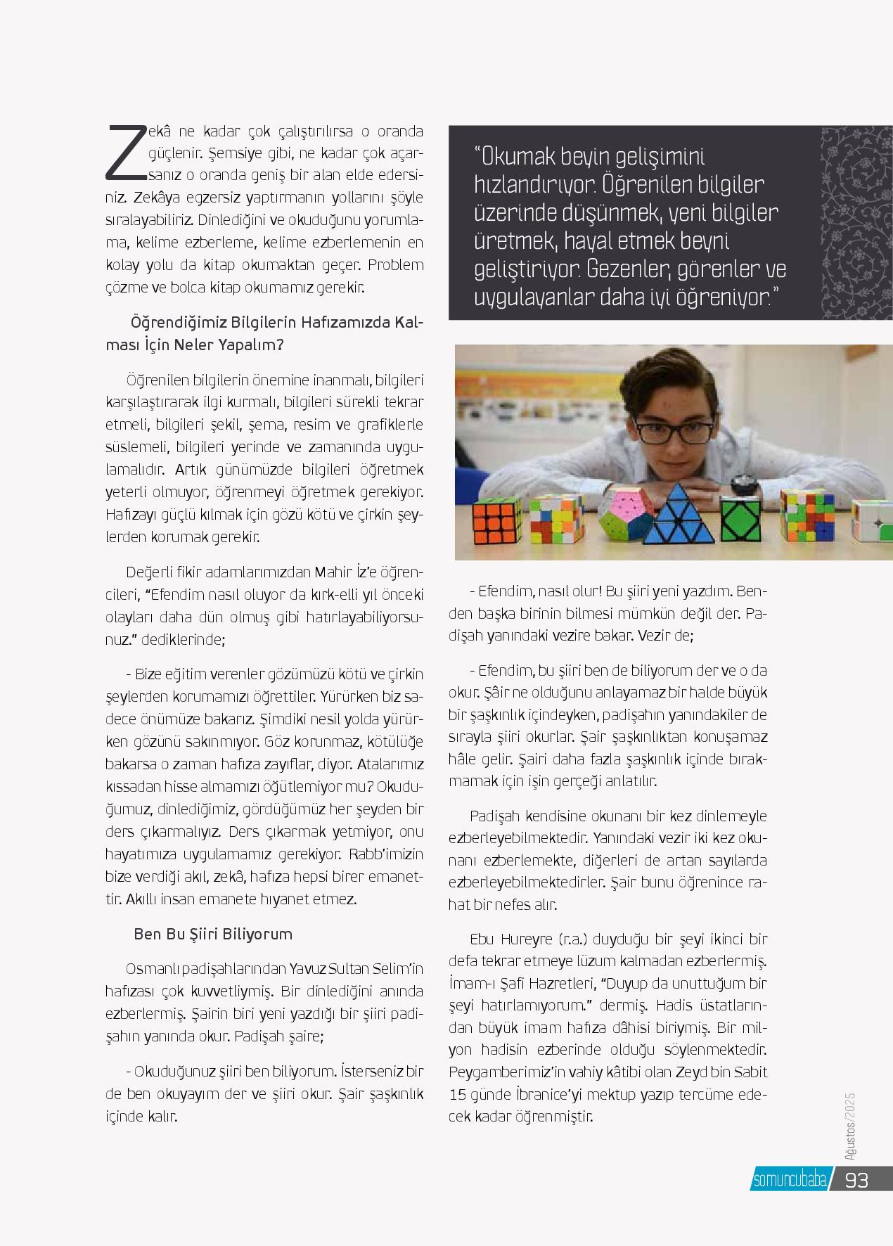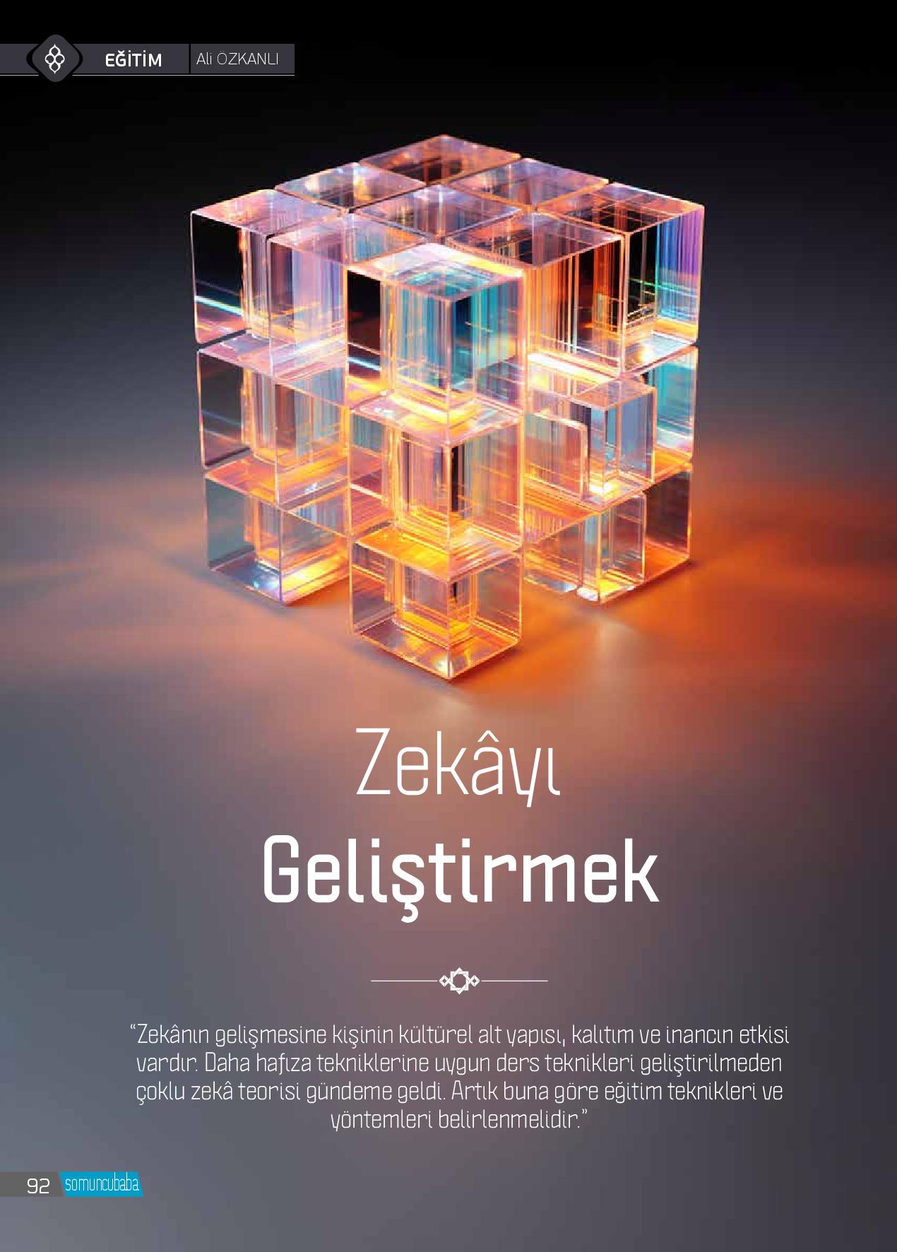 Zekâ ne kadar çok çalıştırılırsa o oranda güçlenir. Şemsiye gibi, ne kadar çok açarsanız o oranda geniş bir alan elde edersiniz. Zekâya egzersiz yaptırmanın yollarını şöyle sıralayabiliriz. Dinlediğini ve okuduğunu yorumlama, kelime ezberleme, kelime ezberlemenin en kolay yolu da k...