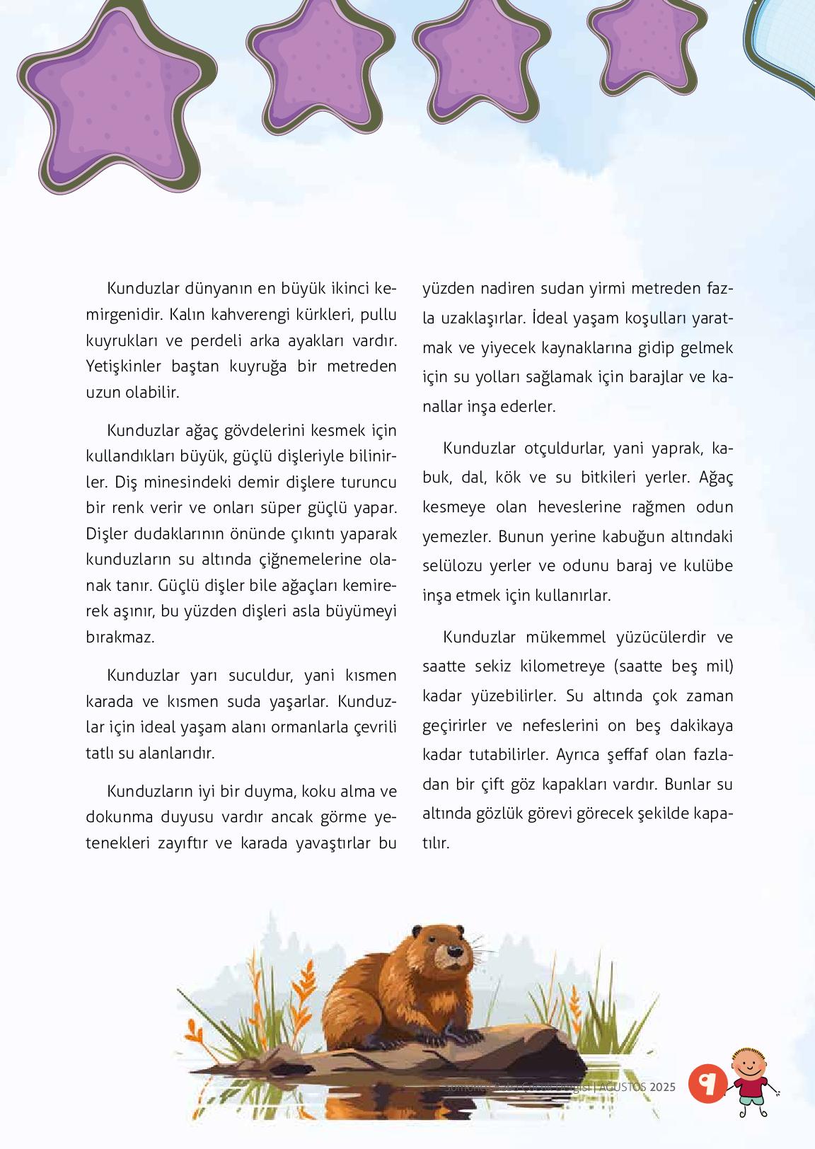 Kunduzlar dünyanın en büyük ikinci kemirgenidir. Kalın kahverengi kürkleri, pullu kuyrukları ve perdeli arka ayakları vardır. Yetişkinler baştan kuyruğa bir metreden uzun olabilir.Kunduzlar ağaç gövdelerini kesmek için kullandıkları büyük, güçlü dişleriyle bilinirler. ...