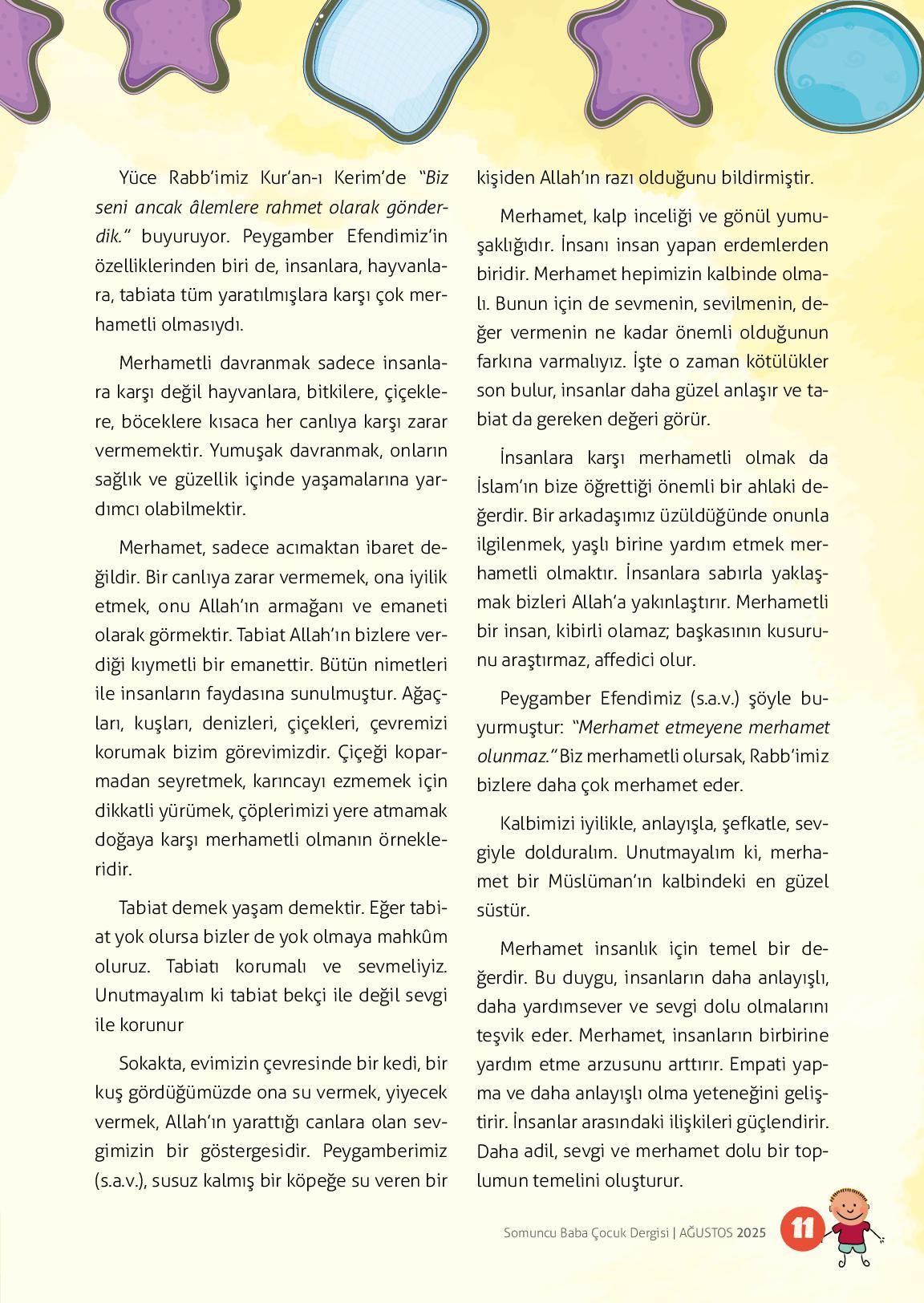 Yüce Rabb’imiz Kur’an-ı Kerim’de “Biz seni ancak âlemlere rahmet olarak gönderdik.” buyuruyor. Peygamber Efendimiz’in özelliklerinden biri de, insanlara, hayvanlara, tabiata tüm yaratılmışlara karşı çok merhametli olmasıydı.Merhametli davranmak sadece insanla...