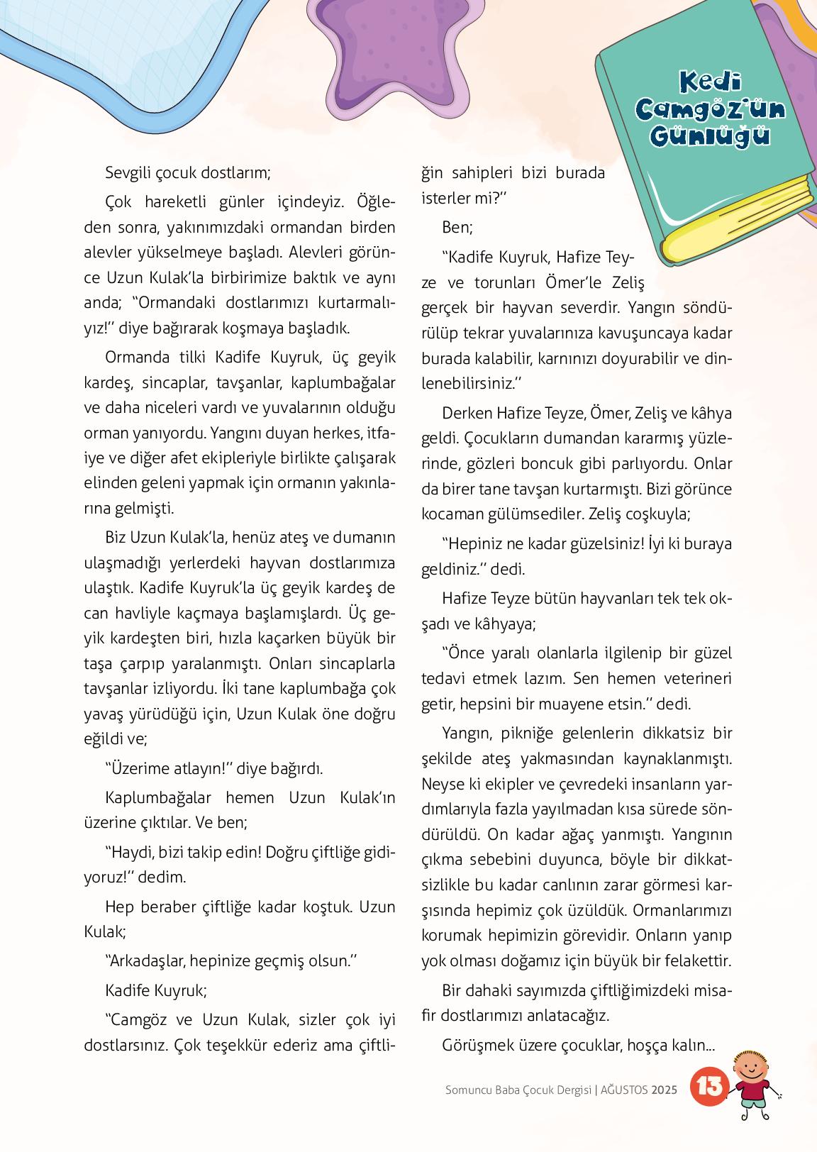 Sevgili çocuk dostlarım;Çok hareketli günler içindeyiz. Öğleden sonra, yakınımızdaki ormandan birden alevler yükselmeye başladı. Alevleri görünce Uzun Kulak’la birbirimize baktık ve aynı anda;“Ormandaki dostlarımızı kurtarmalıyız!” diye bağırarak koşmaya başladık.O...