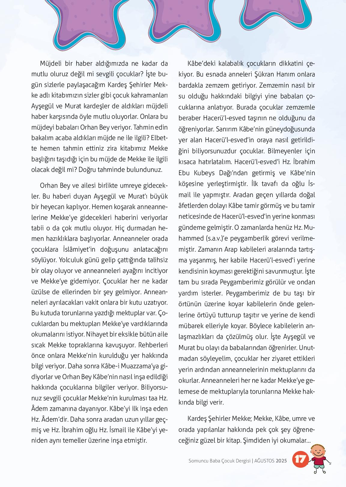Kitabın adı: Kardeş Şehirler MekkeYazar: Hafsa BoynukalınYayınevi: Türkiye Diyanet Vakfı YayınlarıYayın yeri ve yılı: Ankara/2023Sayfa sayısı: 52Yaş aralığı: 8+İşlenen konular: ibadet aşkı, mutluluk, özlem, sevgi, saygı…Müjdeli bir haber aldığımızda ne kadar da mutlu ...