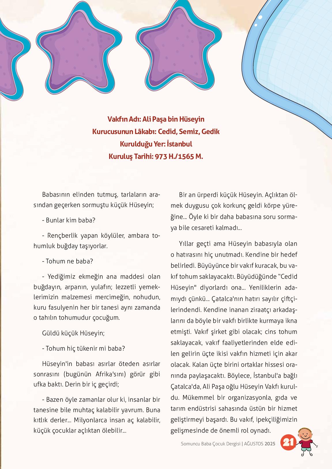 Vakfın Adı: Ali Paşa bin HüseyinKurucusunun Lâkabı: Cedid, Semiz, GedikKurulduğu Yer: İstanbulKuruluş Tarihi: 973 H./1565 M.Babasının elinden tutmuş, tarlaların arasından geçerken sormuştu küçük Hüseyin;- Bunlar kim baba?- Rençberlik yapan köylüler, ambara tohumluk buğday taşıyor...
