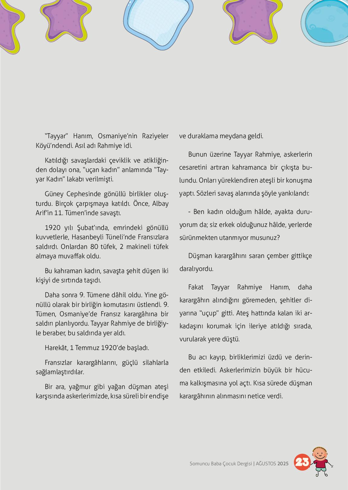 “Tayyar” Hanım, Osmaniye’nin Raziyeler Köyü’ndendi. Asıl adı Rahmiye idi.Katıldığı savaşlardaki çeviklik ve atikliğinden dolayı ona, “uçan kadın” anlamında “Tayyar Kadın” lakabı verilmişti.Güney Cephesinde gönüllü birlikler oluşturdu. Birçok çarpışmaya katıldı. Önce, Albay Arif’i...