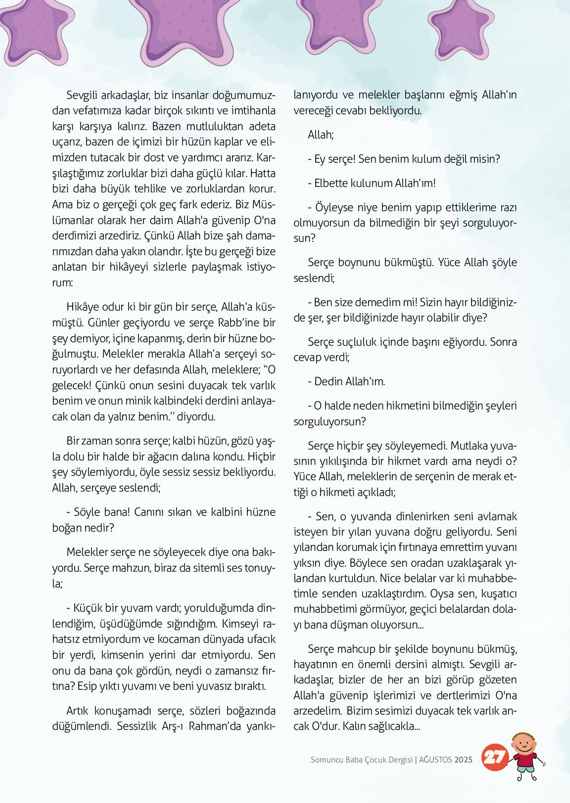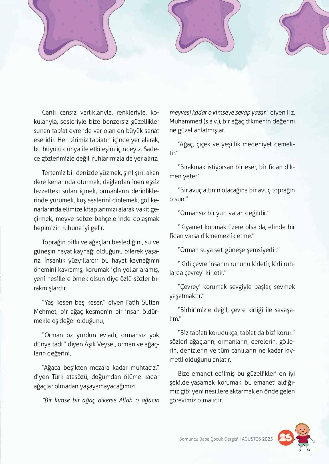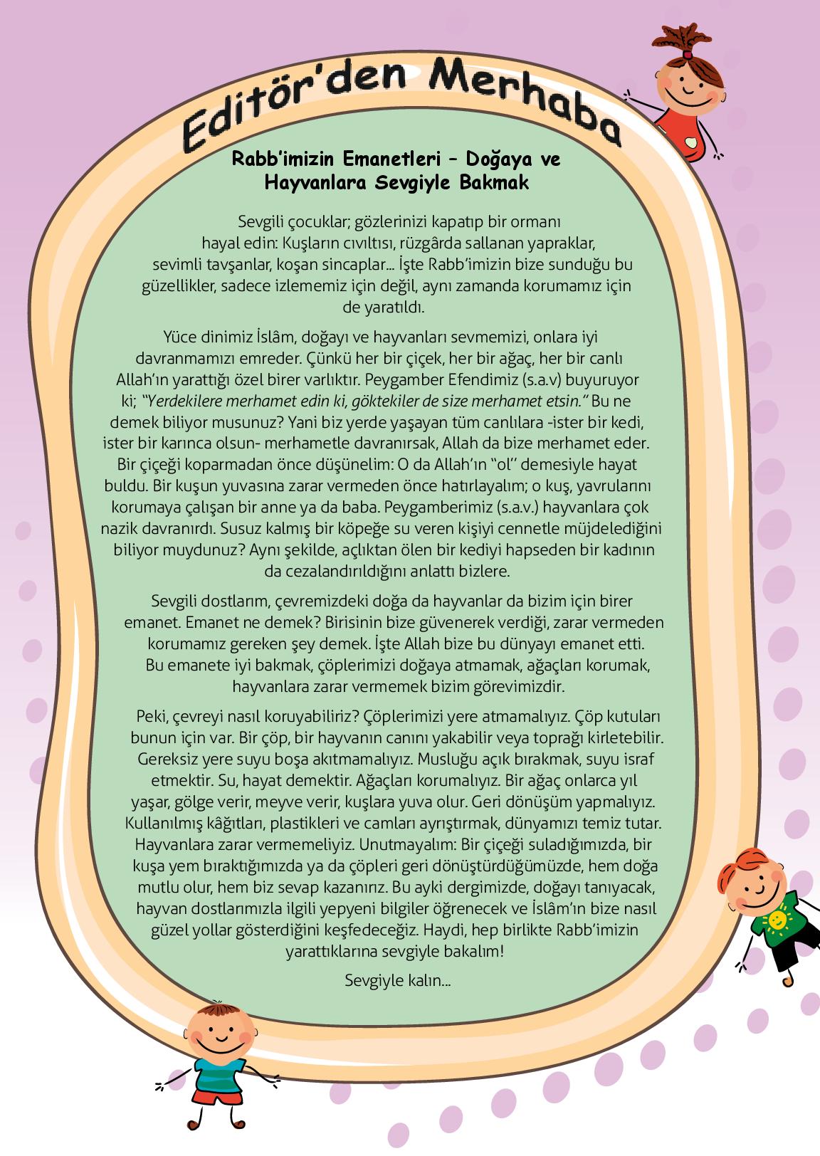 Sevgili çocuklar;Gözlerinizi kapatıp bir ormanı hayal edin: Kuşların cıvıltısı, rüzgârda sallanan yapraklar, sevimli tavşanlar, koşan sincaplar... İşte Rabb’imizin bize sunduğu bu güzellikler, sadece izlememiz için değil, aynı zamanda korumamız için de yaratıldı.Y...