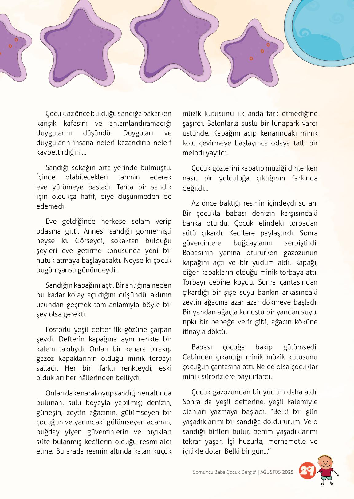 Çocuk, az önce bulduğu sandığa bakarken karışık kafasını ve anlamlandıramadığı duygularını düşündü. Duyguları ve duyguların insana neleri kazandırıp neleri kaybettirdiğini...Sandığı sokağın orta yerinde bulmuştu. İçinde olabilecekleri tahmin ederek eve yürümeye başladı. Tahta bir sandık...