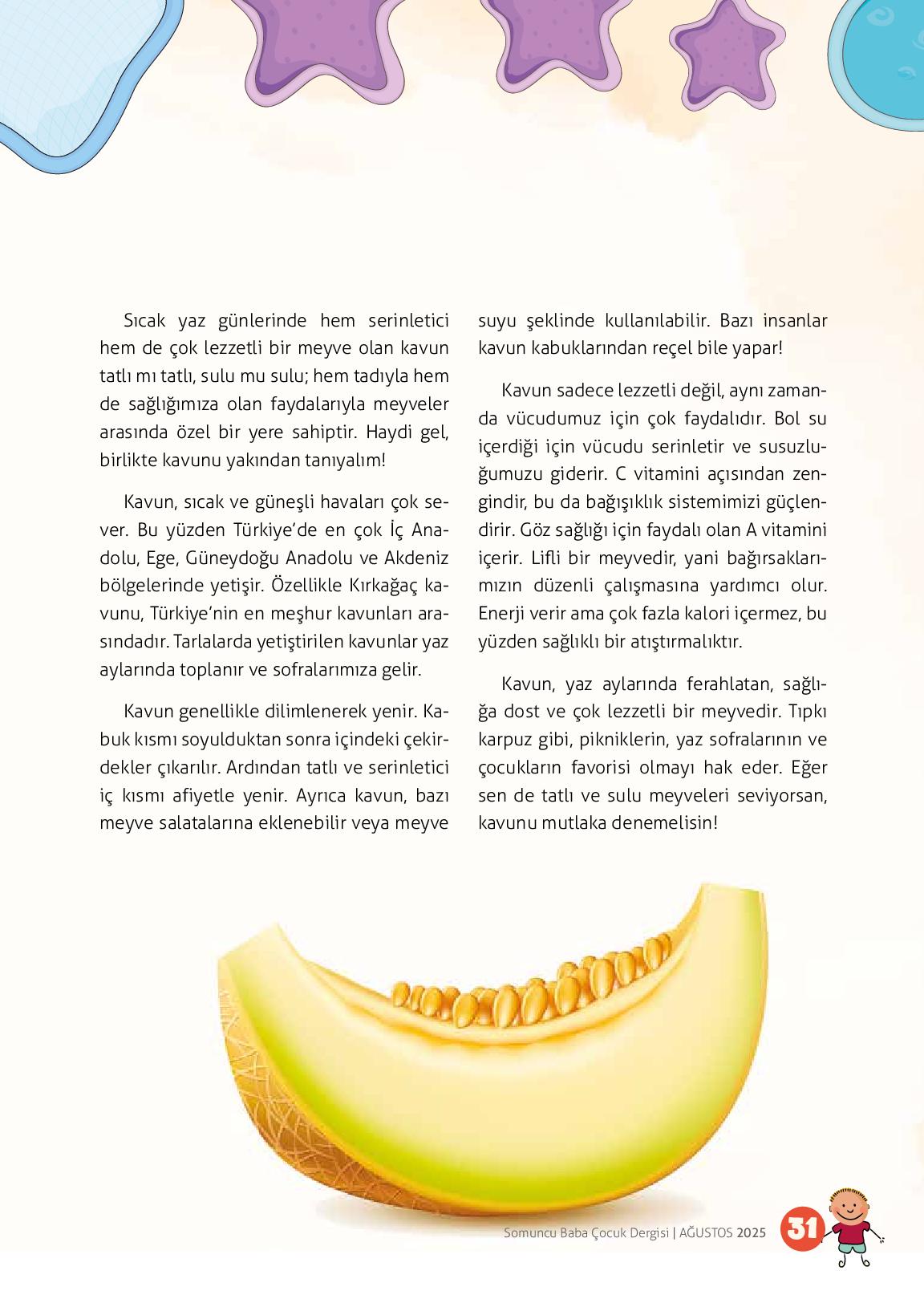 Sıcak yaz günlerinde hem serinletici hem de çok lezzetli bir meyve olan kavun tatlı mı tatlı, sulu mu sulu; hem tadıyla hem de sağlığımıza olan faydalarıyla meyveler arasında özel bir yere sahiptir. Haydi gel, birlikte kavunu yakından tanıyalım!Kavun, sıcak ve güneşli haval...