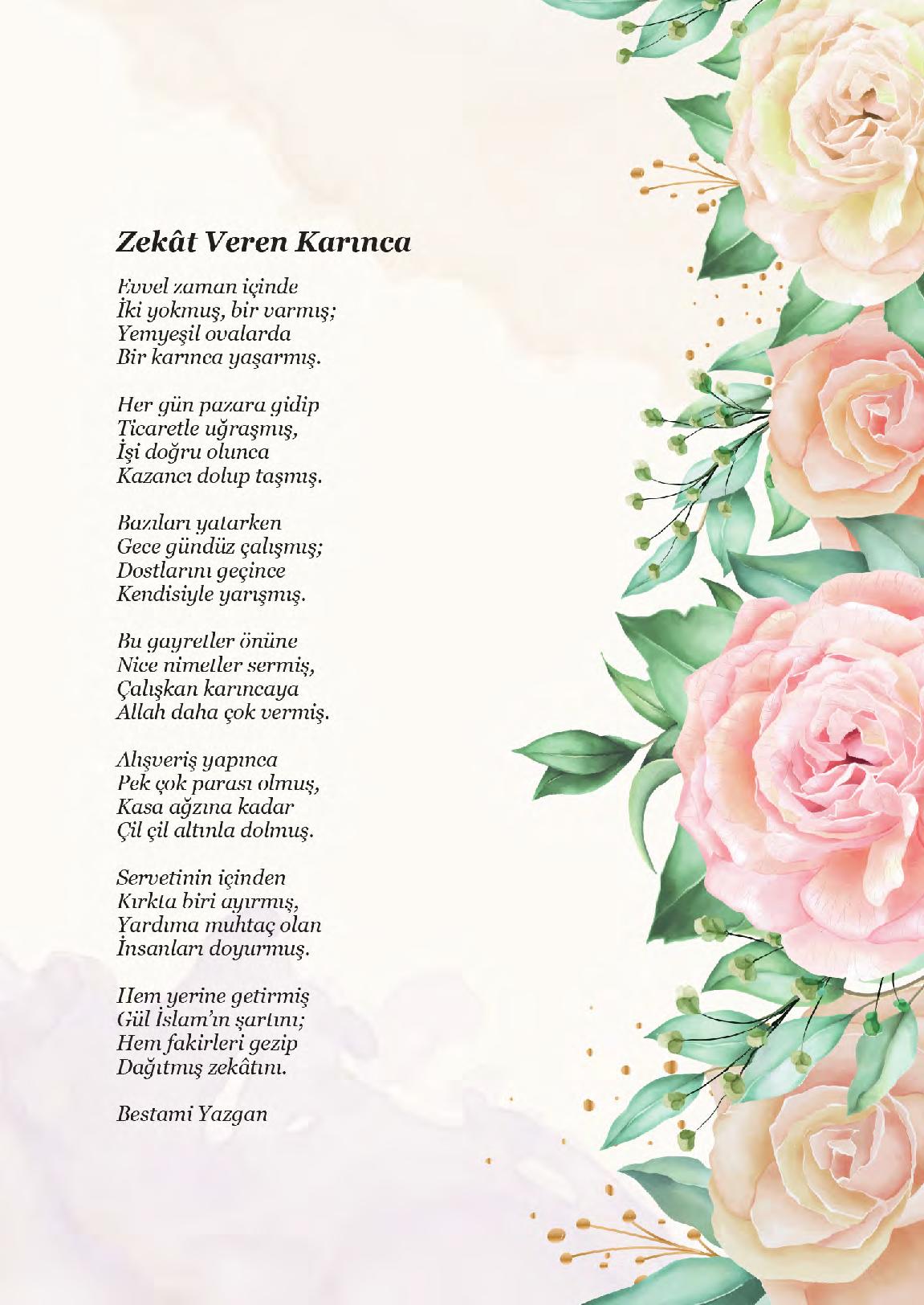 Evvel zaman içindeİki yokmuş, bir varmış;Yemyeşil ovalardaBir karınca yaşarmış.Her gün pazara gidipTicaretle uğraşmış,İşi doğru oluncaKazancı dolup taşmış.Bazıları yatarkenGece gündüz çalışmış;Dostlarını geçinceKendisiyle yarışmış.Bu gayretler önüneNice nimetler sermiş,Çalışkan ka...
