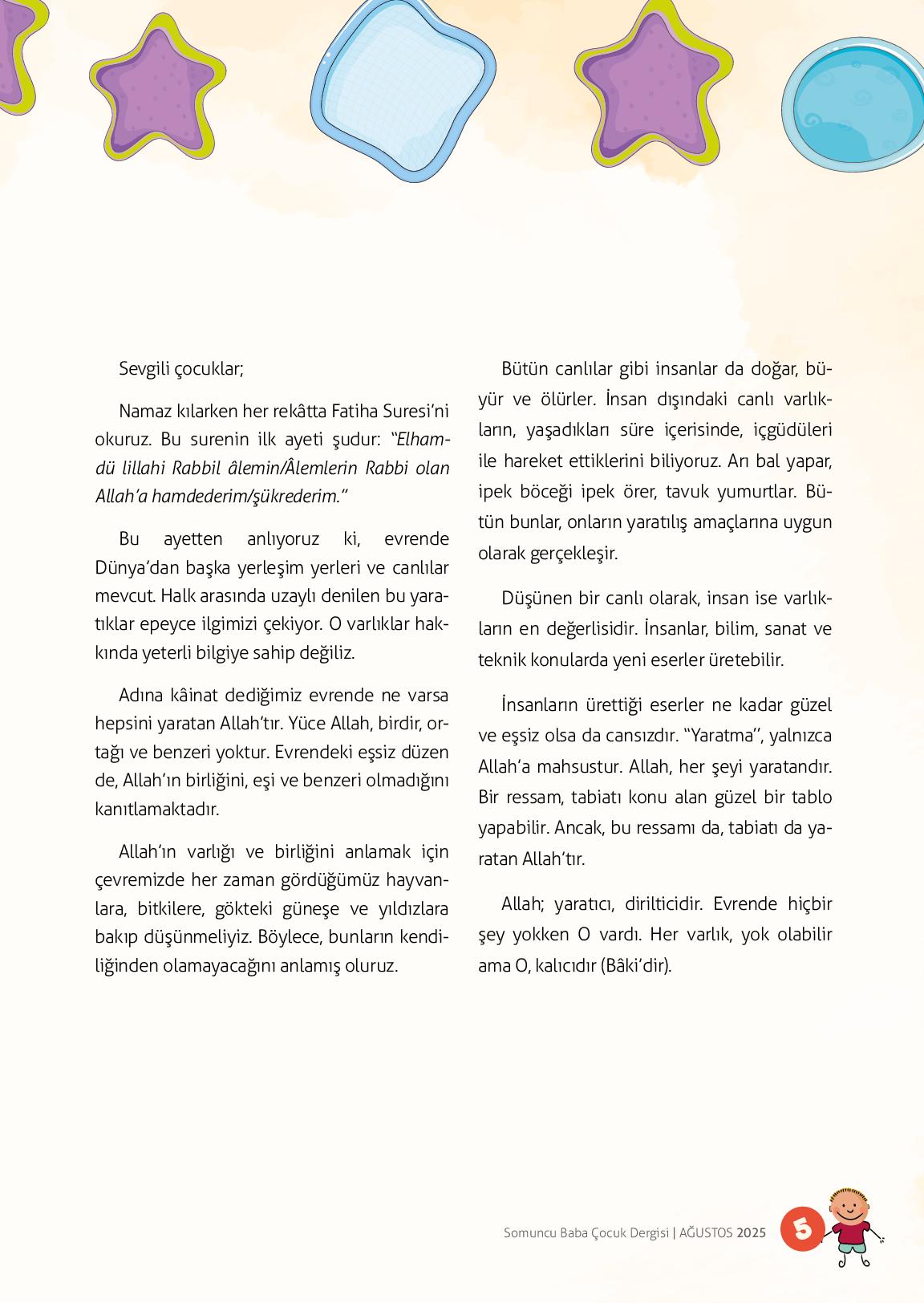 Sevgili çocuklar;Namaz kılarken her rekâtta Fatiha Suresi’ni okuruz. Bu surenin ilk ayeti şudur: “Elhamdü lillahi Rabbil âlemin/Âlemlerin Rabbi olan Allah’a hamdederim/şükrederim.”Bu ayetten anlıyoruz ki, evrende Dünya’dan başka yerleşim yerleri ve canlılar mevcut. Halk ara...