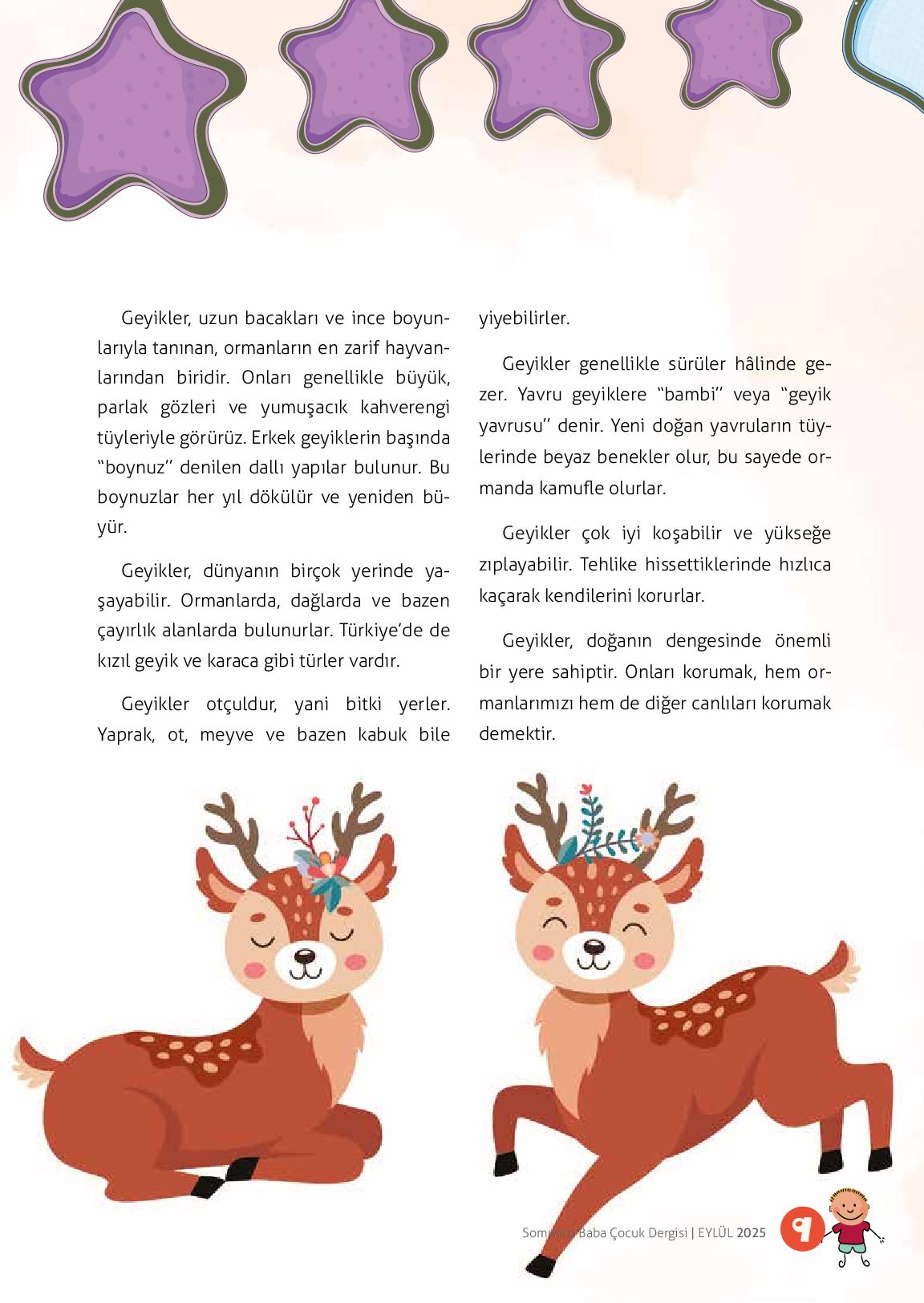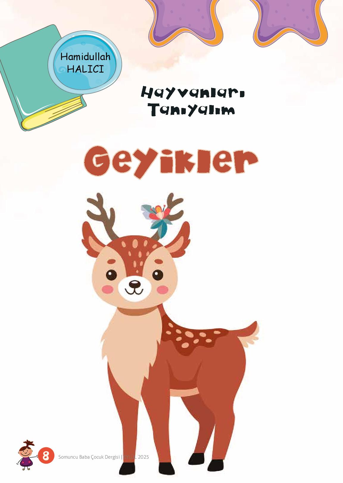 Geyikler, uzun bacakları ve ince boyunlarıyla tanınan, ormanların en zarif hayvanlarından biridir. Onları genellikle büyük, parlak gözleri ve yumuşacık kahverengi tüyleriyle görürüz. Erkek geyiklerin başında “boynuz” denilen dallı yapılar bulunur. Bu boynuzlar her yıl dökülür ve yeniden büyü...