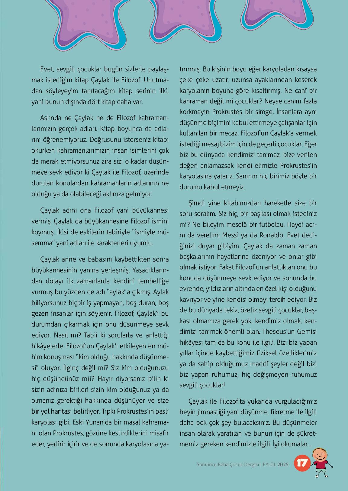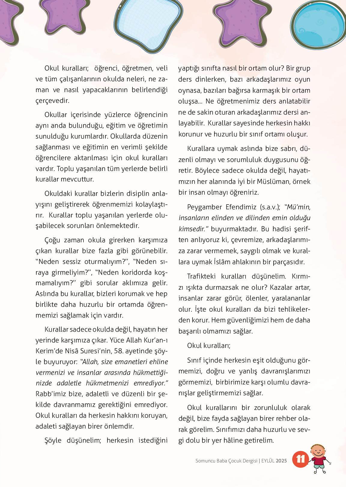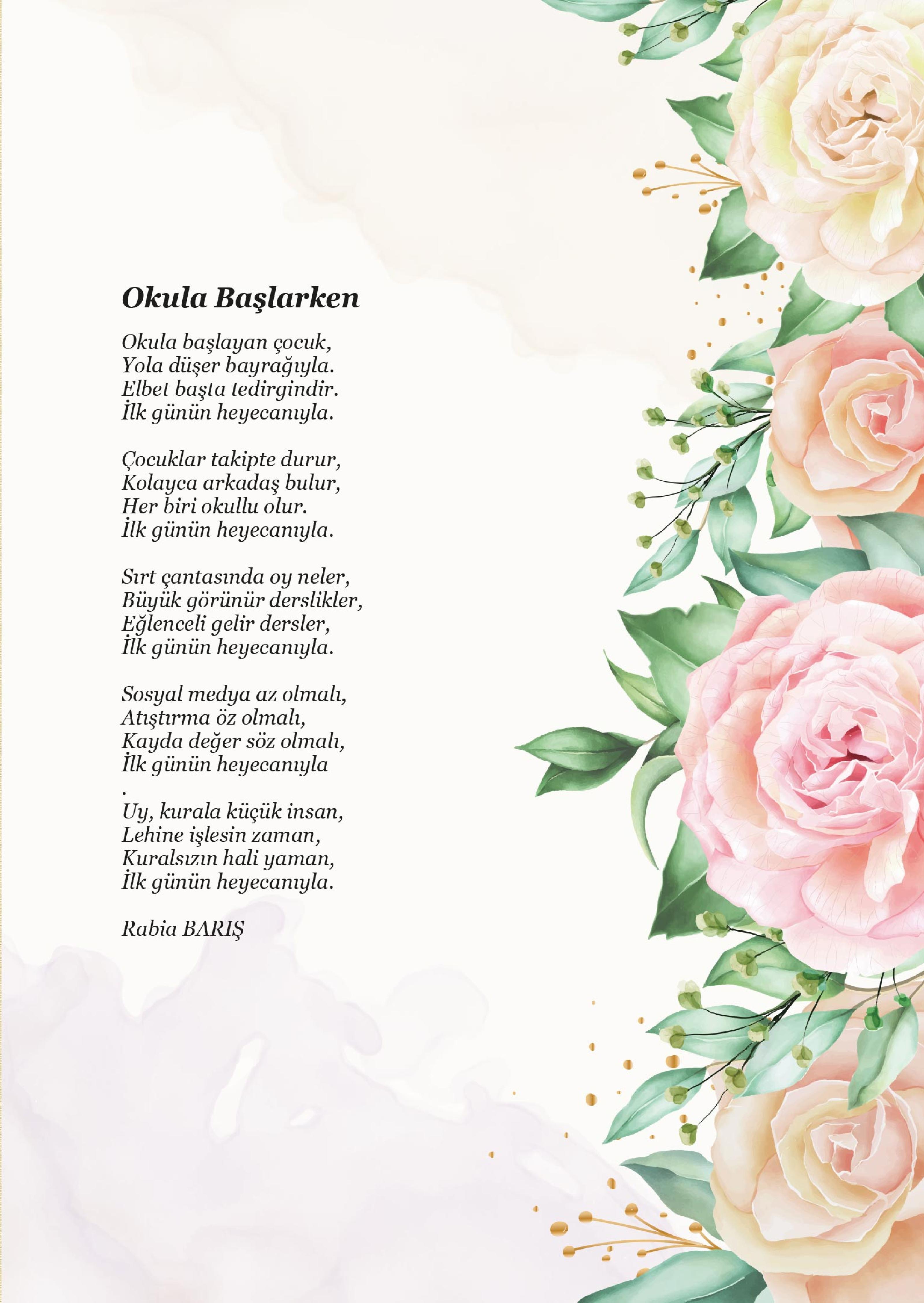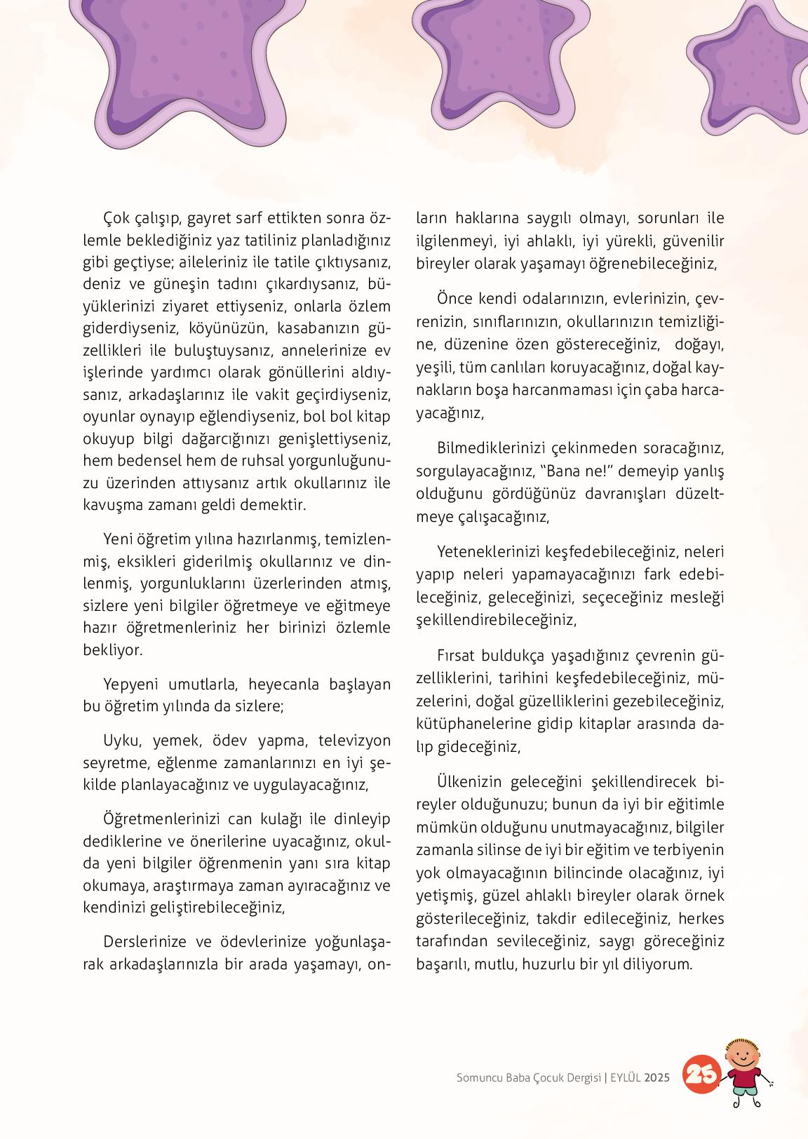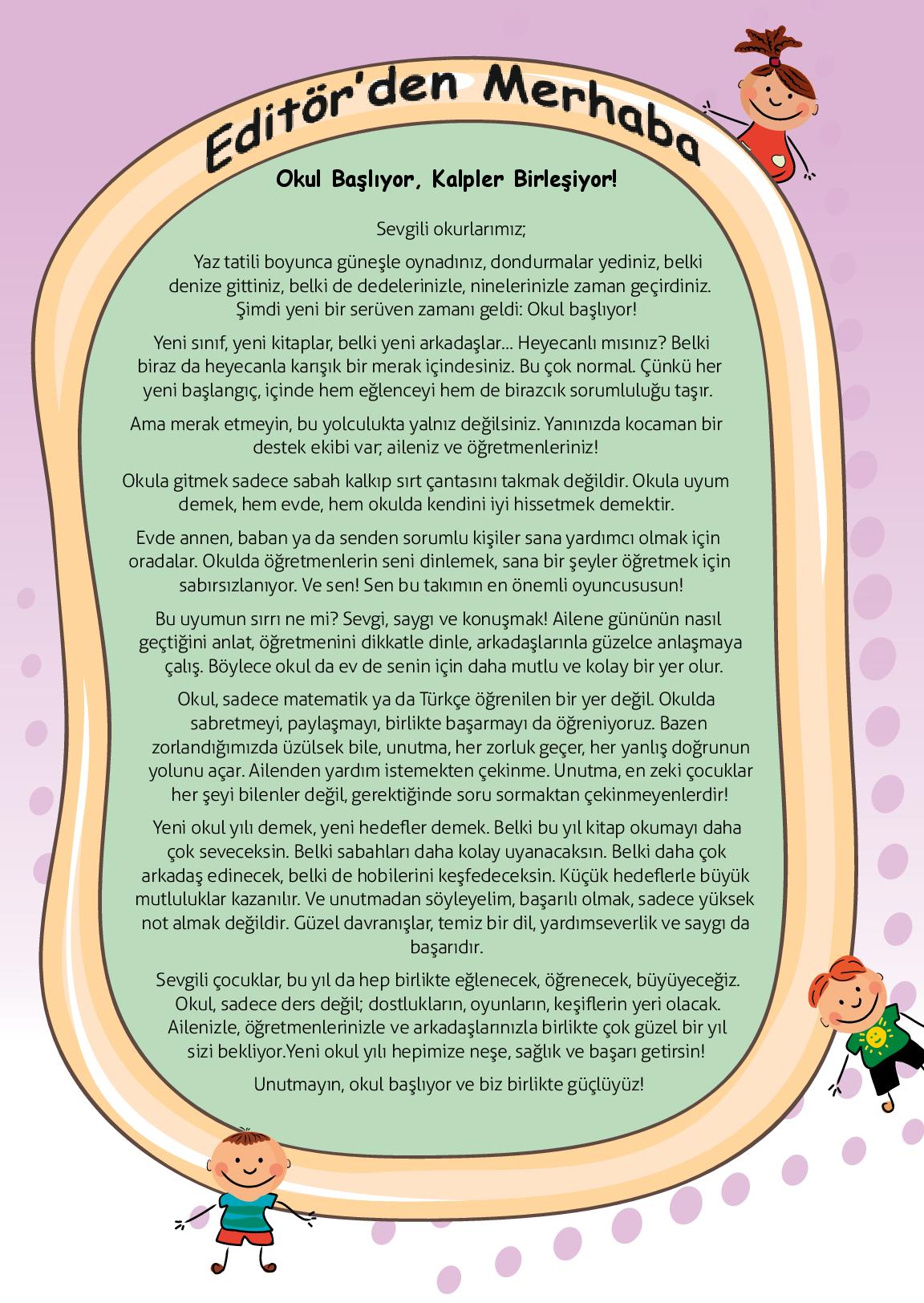 Sevgili okurlarımız;Yaz tatili boyunca güneşle oynadınız, dondurmalar yediniz, belki denize gittiniz, belki de dedelerinizle, ninelerinizle zaman geçirdiniz. Şimdi yeni bir serüven zamanı geldi: Okul başlıyor!Yeni sınıf, yeni kitaplar, belki yeni arkadaşlar… Heyecanl...