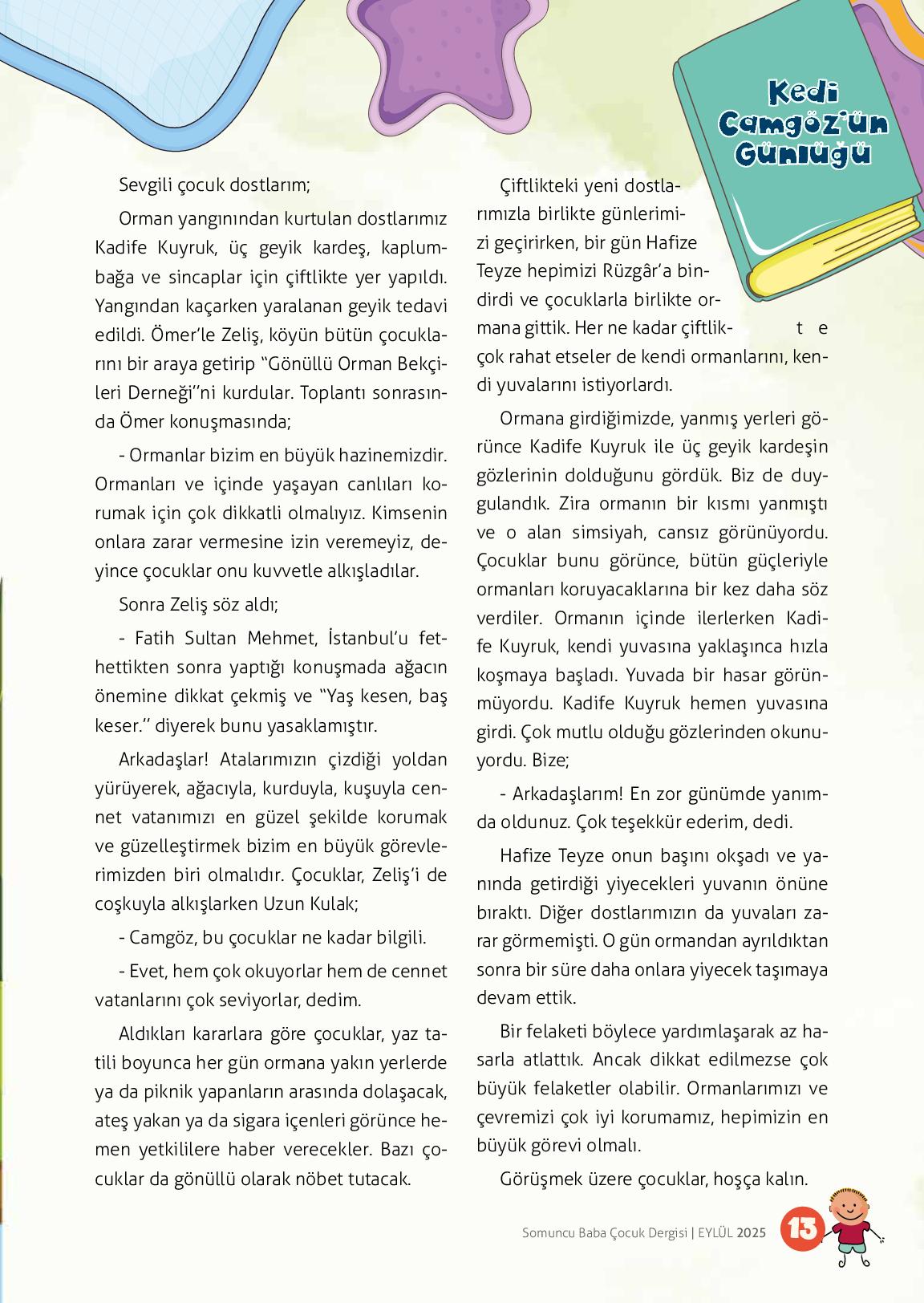 Sevgili çocuk dostlarım;Orman yangınından kurtulan dostlarımız Kadife Kuyruk, üç geyik kardeş, kaplumbağa ve sincaplar için çiftlikte yer yapıldı. Yangından kaçarken yaralanan geyik tedavi edildi. Ömer’le Zeliş, köyün bütün çocuklarını bir araya getirip “Gönüllü Orman Bekçileri De...