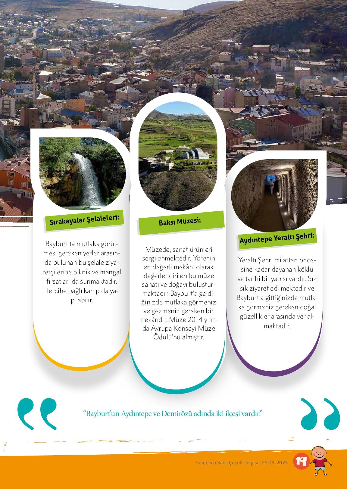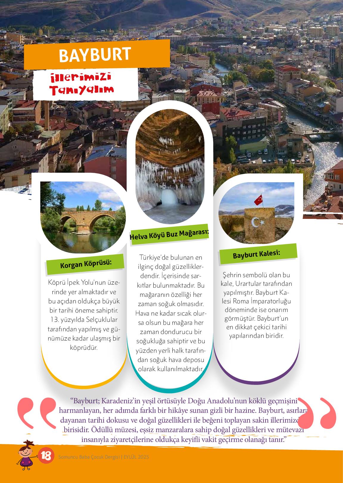 “Bayburt; Karadeniz’in yeşil örtüsüyle Doğu Anadolu’nun köklü geçmişini harmanlayan, her adımda farklı bir hikâye sunan gizli bir hazine. Bayburt, asırlara dayanan tarihi dokusu ve doğal güzellikleri ile beğeni toplayan sakin illerimizden birisidir. Ödüllü müzesi, eşsiz manzaralara sahip doğa...