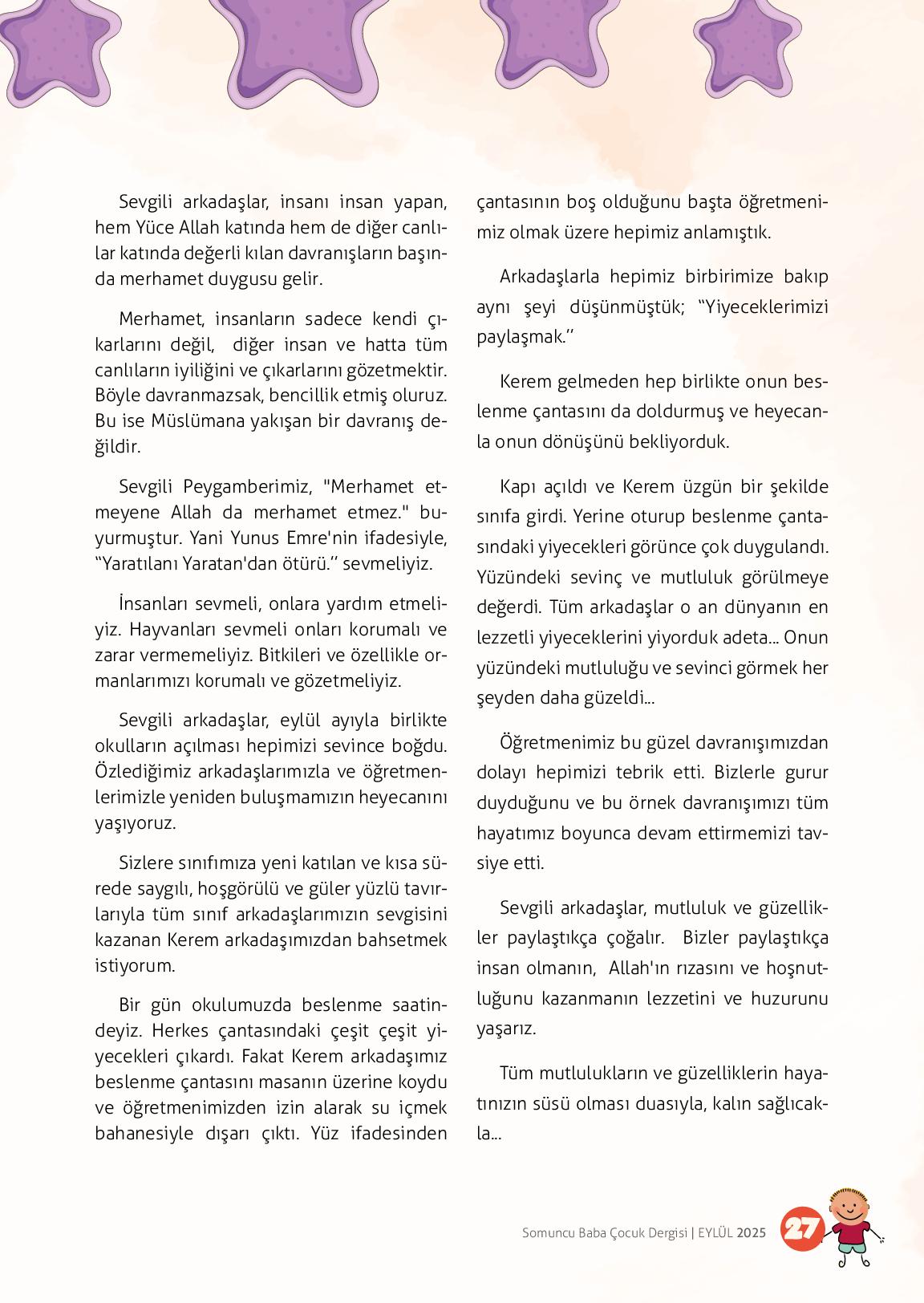 Sevgili arkadaşlar, insanı insan yapan, hem Yüce Allah katında hem de diğer canlılar katında değerli kılan davranışların başında merhamet duygusu gelir.Merhamet, insanların sadece kendi çıkarlarını değil, diğer insan ve hatta tüm canlıların iyiliğini ve çıkarlarını gö...