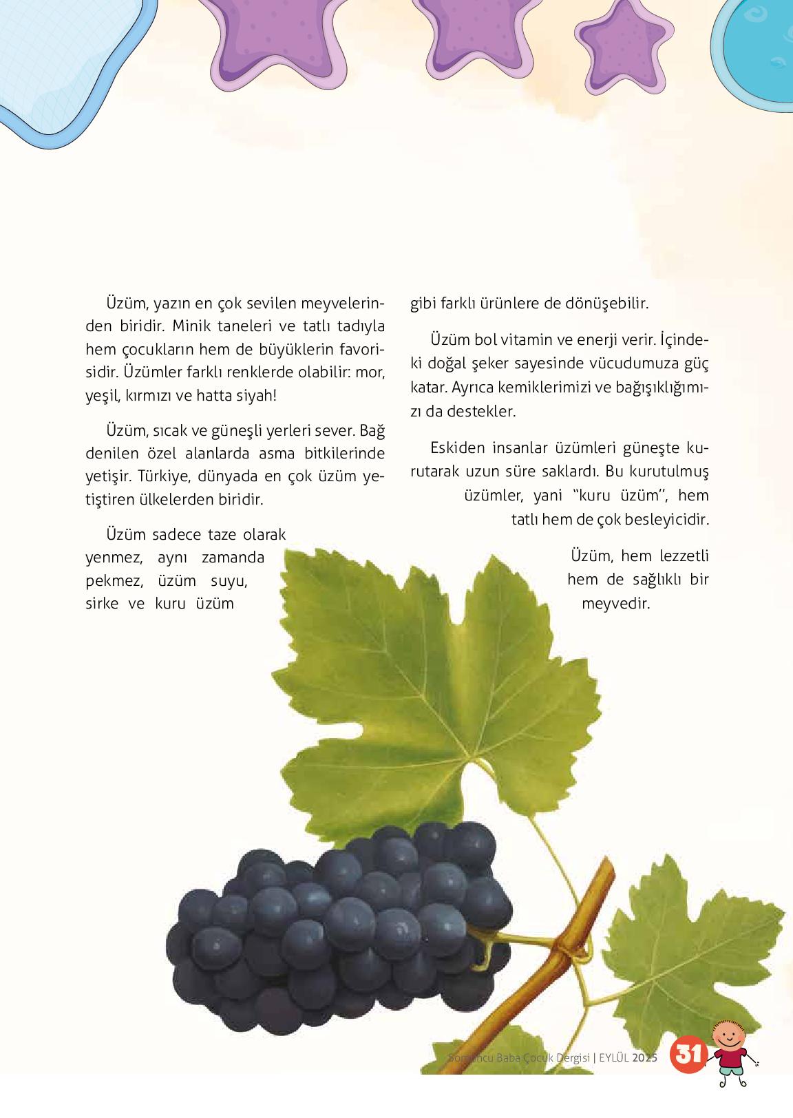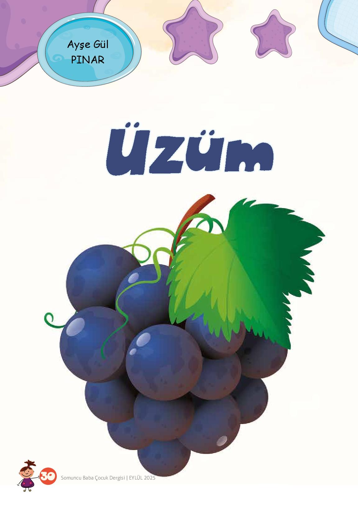 Üzüm, yazın en çok sevilen meyvelerinden biridir. Minik taneleri ve tatlı tadıyla hem çocukların hem de büyüklerin favorisidir. Üzümler farklı renklerde olabilir: mor, yeşil, kırmızı ve hatta siyah!Üzüm, sıcak ve güneşli yerleri sever. Bağ denilen özel alanlarda asma bitkilerinde yetişir. Türkiy...