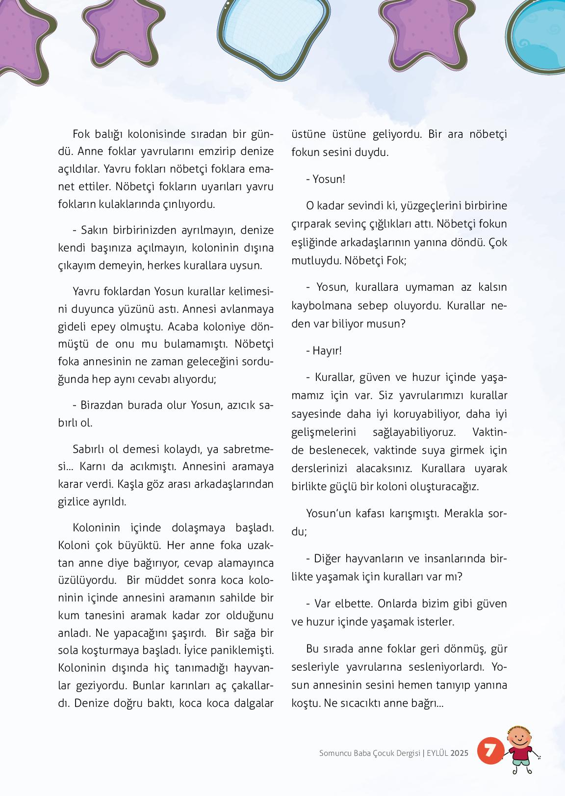 Fok balığı kolonisinde sıradan bir gündü. Anne foklar yavrularını emzirip denize açıldılar. Yavru fokları nöbetçi foklara emanet ettiler. Nöbetçi fokların uyarıları yavru fokların kulaklarında çınlıyordu.- Sakın birbirinizden ayrılmayın, denize kendi başınıza açılmayın, koloninin dışına çıkayım...