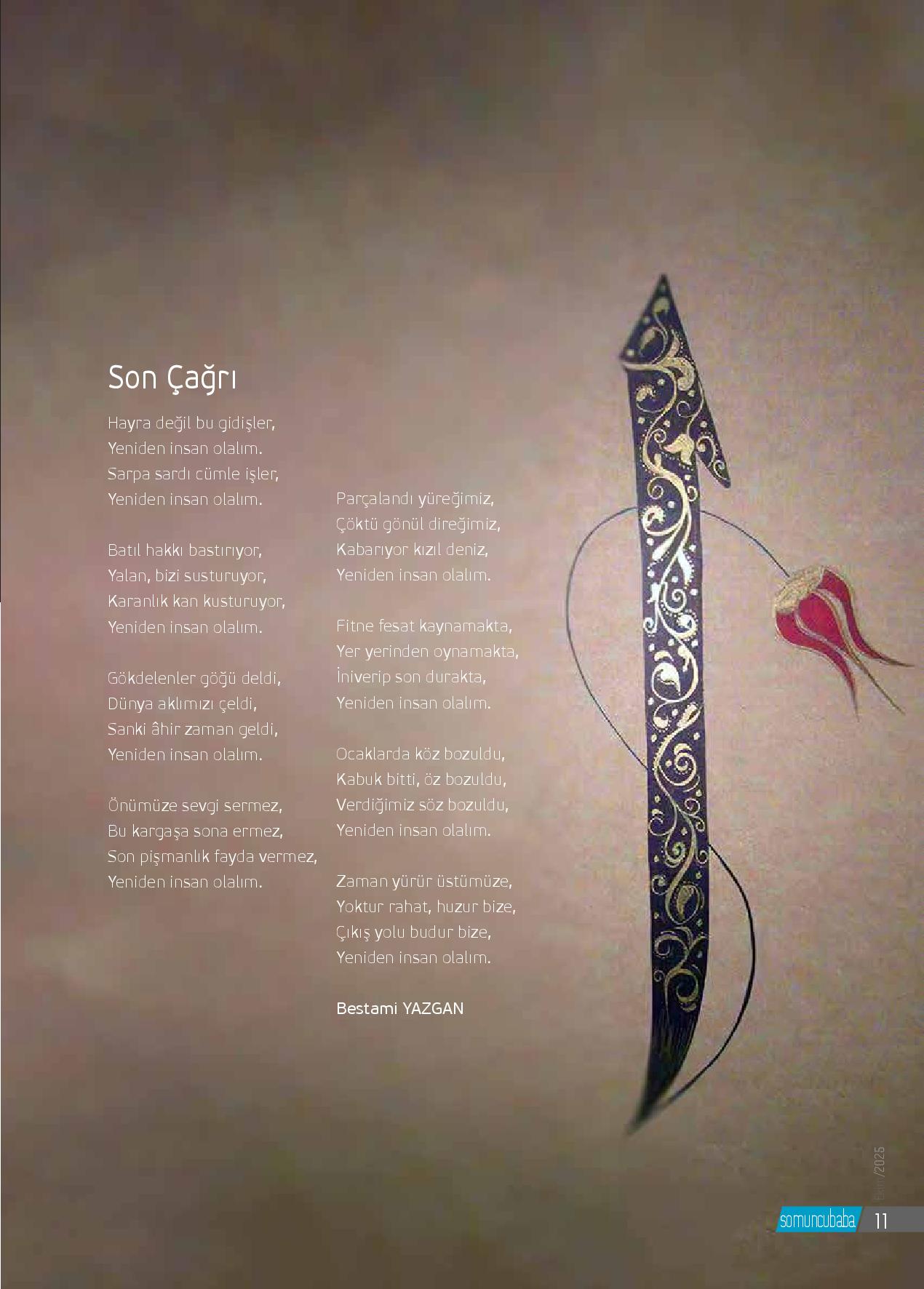 Hayra değil bu gidişler,Yeniden insan olalım.Sarpa sardı cümle işler,Yeniden insan olalım.Batıl hakkı bastırıyor,Yalan, bizi susturuyor,Karanlık kan kusturuyor,Yeniden insan olalım.Gökdelenler göğü deldi,Dünya aklımızı çeldi,Sanki âhir zaman geldi,Yeniden insan olalım.Önümüze sevgi sermez,B...