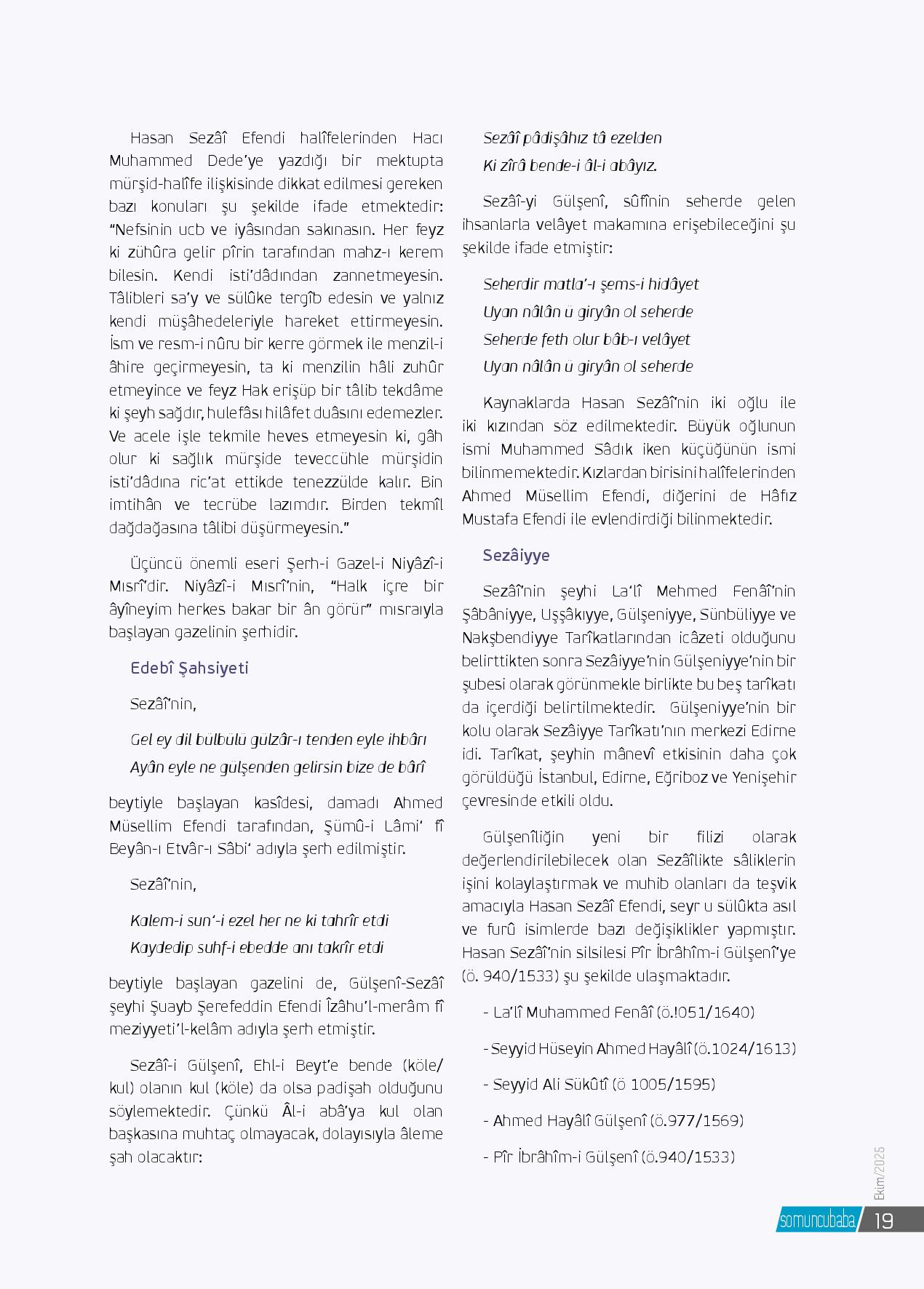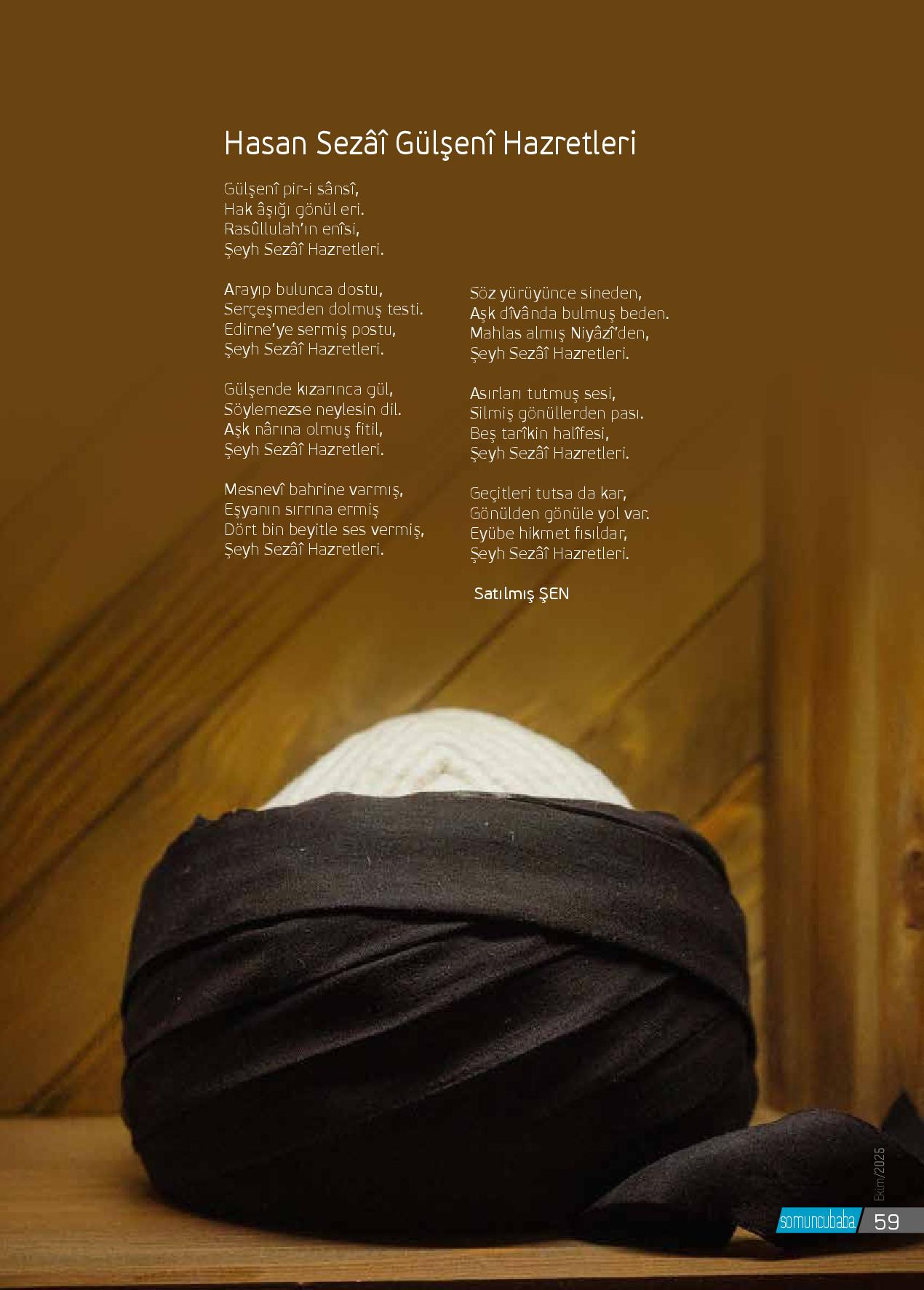 Gülşenî pir-i sânisi,Hak aşığı gönül eri.Rasûllulah’ın enîsi,Şeyh Sezâî Hazretleri.Arayıp bulunca dostu,Serçeşmeden dolmuş testi.Edirne’ye sermiş postu,Şeyh Sezâî Hazretleri.Gülşende kızarınca gül,Söylemezse neylesin dil.Aşk narına olmuş fitil,Şeyh Sezâî Hazretleri.Mesn...