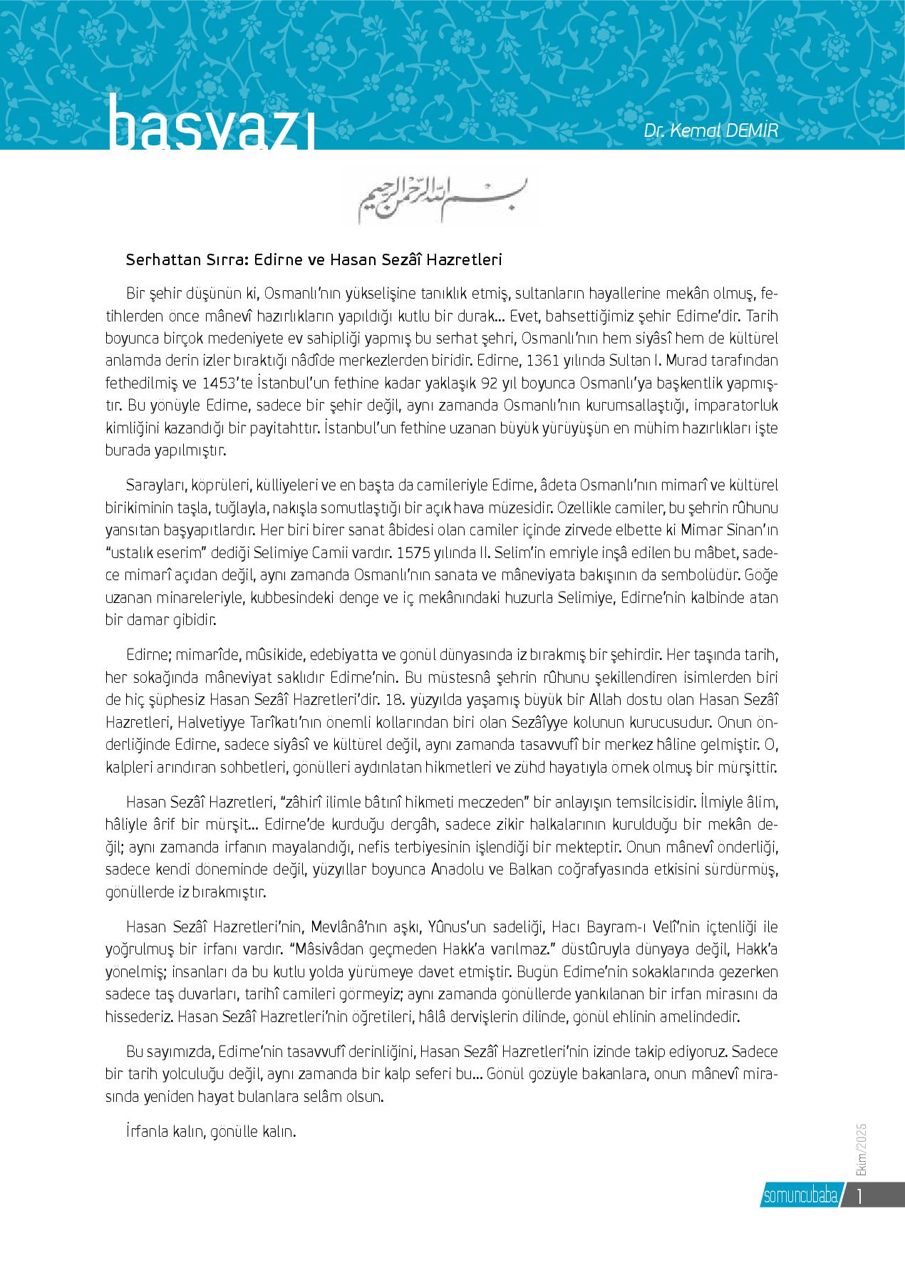 Serhattan Sırra: Edirne ve Hasan Sezâî Hazretleri