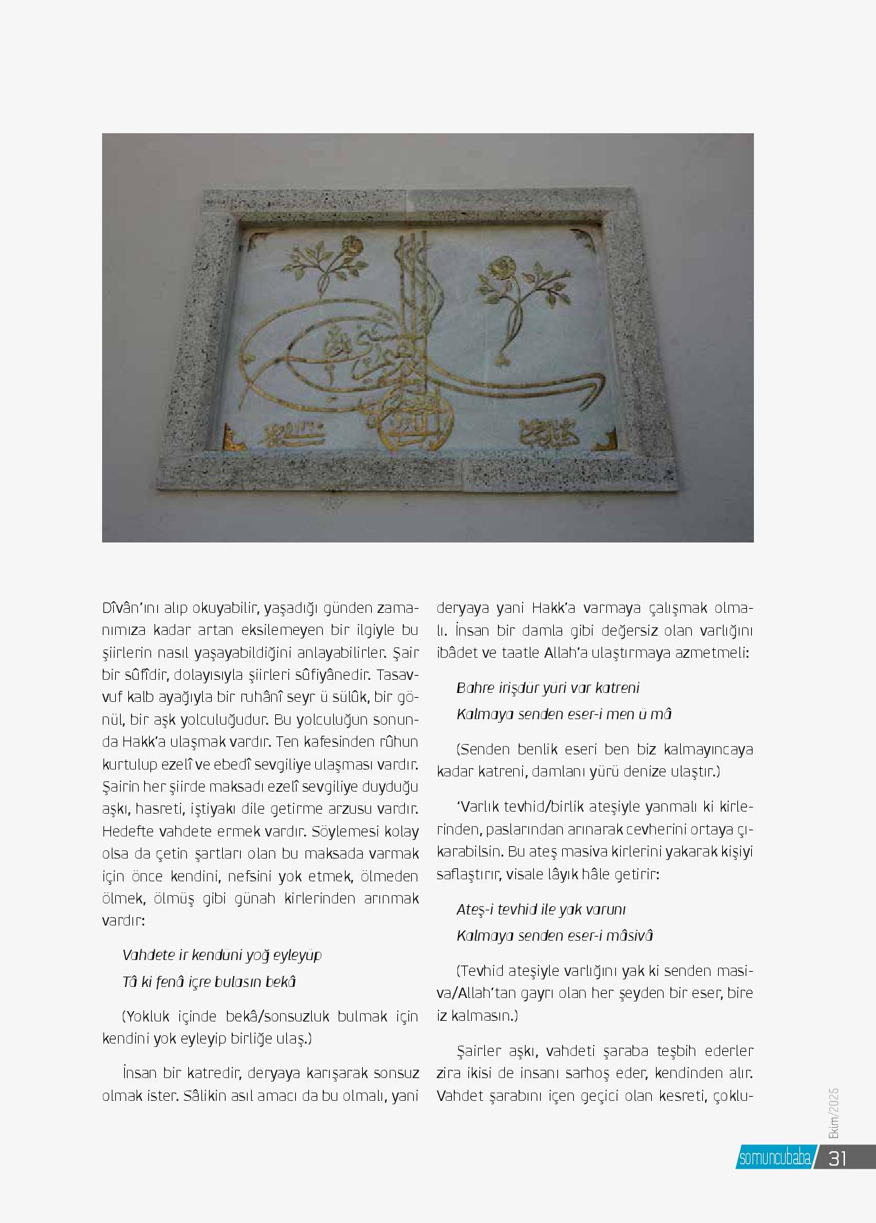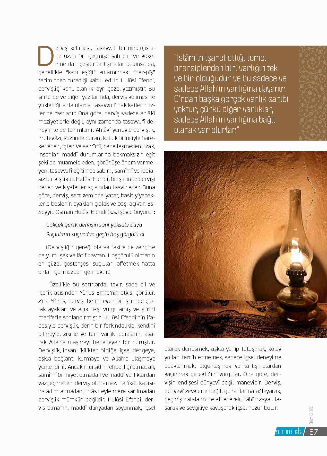 Derviş kelimesi, tasavvuf terminolojisinde uzun bir geçmişe sahiptir ve kökenine dair çeşitli tartışmalar bulunsa da, genellikle “kapı eşiği” anlamındaki “der-pîş” teriminden türediği kabul edilir. Hulûsi Efendi, dervişliği konu alan iki ayrı gazel...