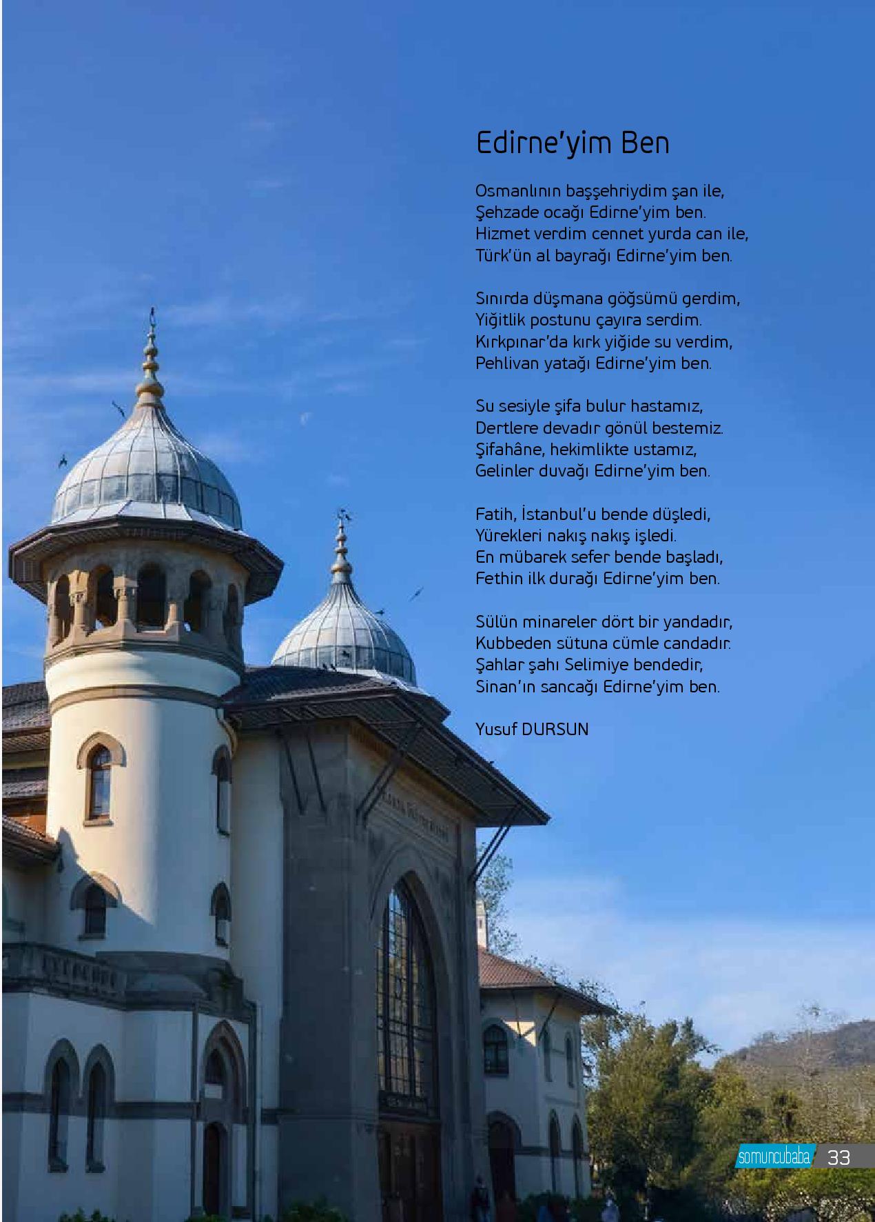 Osmanlının başşehriydim şan ile,Şehzade ocağı Edirne’yim ben.Hizmet verdim cennet yurda can ile,Türk’ün al bayrağı Edirne’yim ben.Sınırda düşmana göğsümü gerdim,Yiğitlik postunu çayıra serdim.Kırkpınar’da kırk yiğide su verdim,Pehlivan yatağı Edirne’yim ben.Su sesiyle şifa bulur hastam...