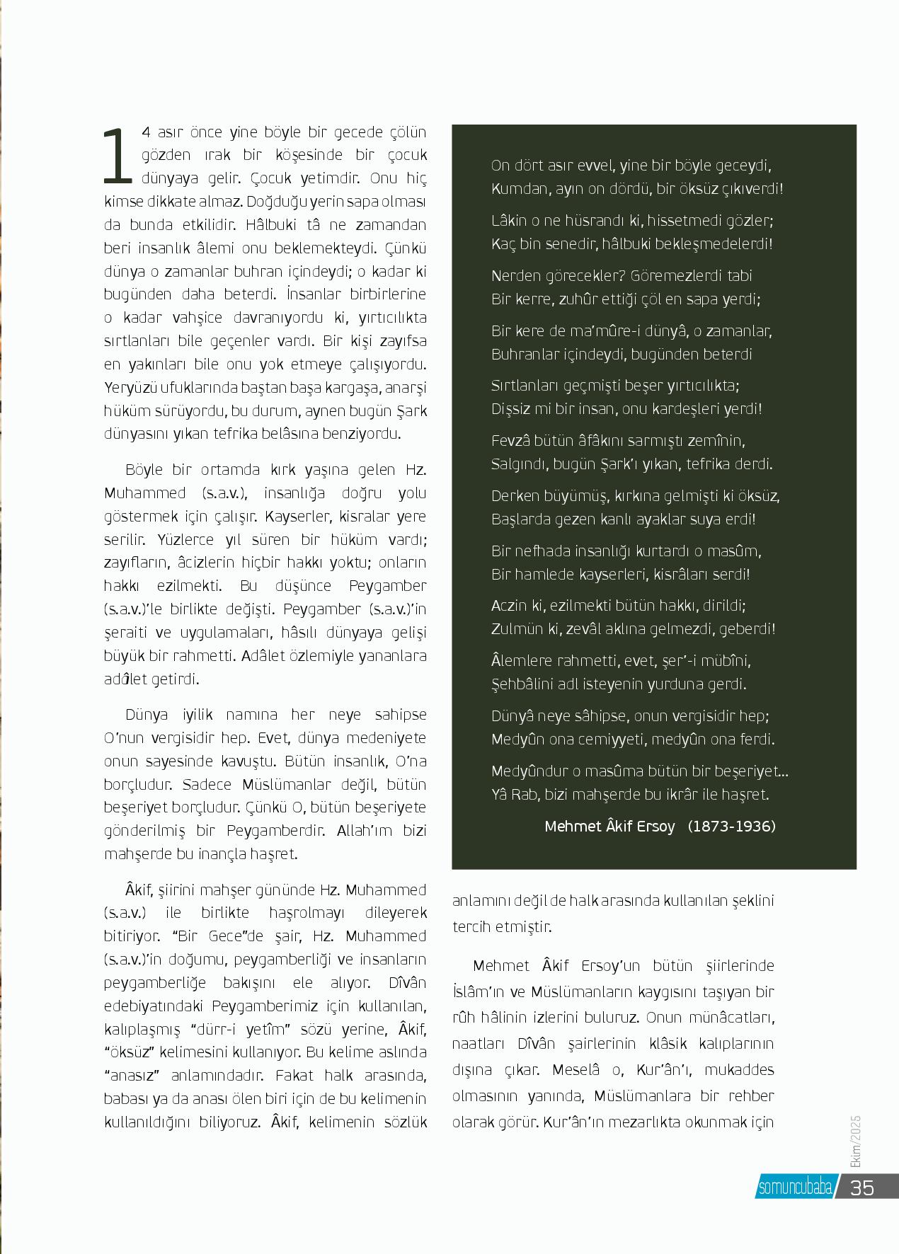 On dört asır evvel, yine bir böyle geceydi,Kumdan, ayın on dördü, bir öksüz çıkıverdi!Lâkin o ne hüsrandı ki, hissetmedi gözler;Kaç bin senedir, hâlbuki bekleşmedelerdi!Nerden görecekler? Göremezlerdi tabiBir kerre, zuhûr ettiği çöl en sapa yerdi;Bir kere de ma’mûre-i dünyâ, o zamanlar,Buhra...