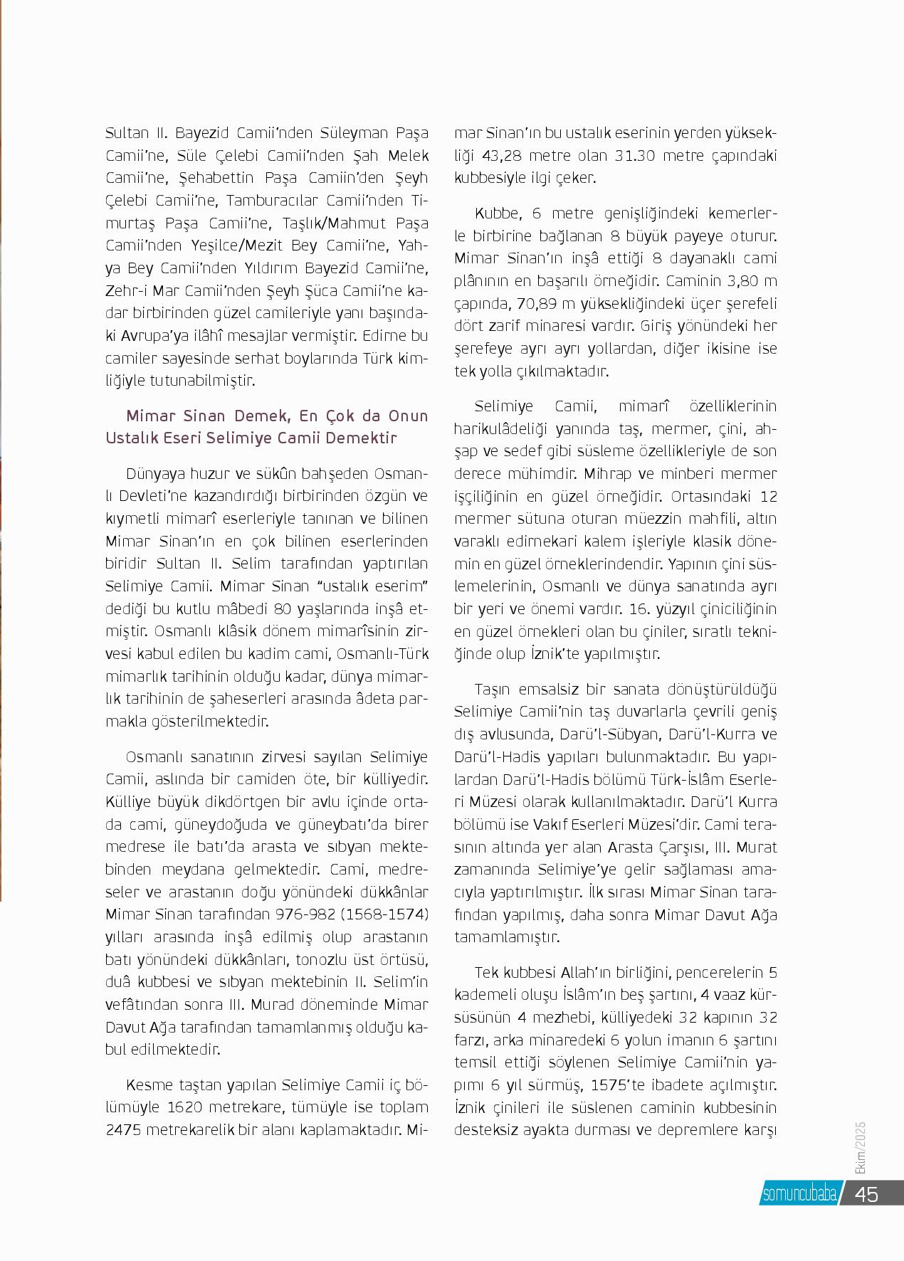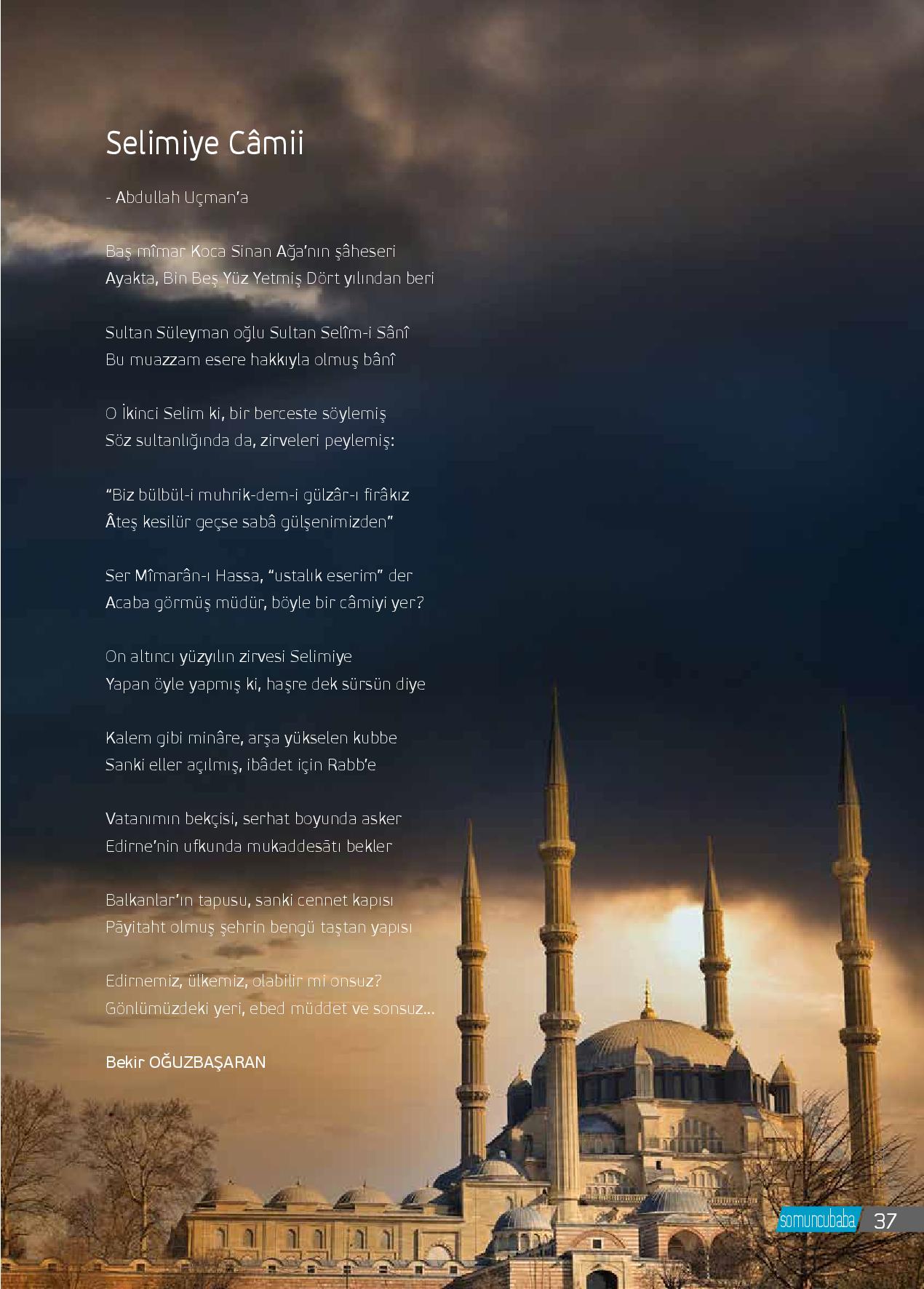 - Abdullah Uçman'aBaş mîmar Koca Sinan Ağa'nın şâheseriAyakta, Bin Beş Yüz Yetmiş Dört yılından beriSultan Süleyman oğlu Sultan Selîm-i SânîBu muazzam esere hakkıyla olmuş bânîO İkinci Selim ki, bir berceste söylemişSöz sultanlığında da, zirveleri peylemiş:"Biz bülbül-i muhrik-dem-i gü...