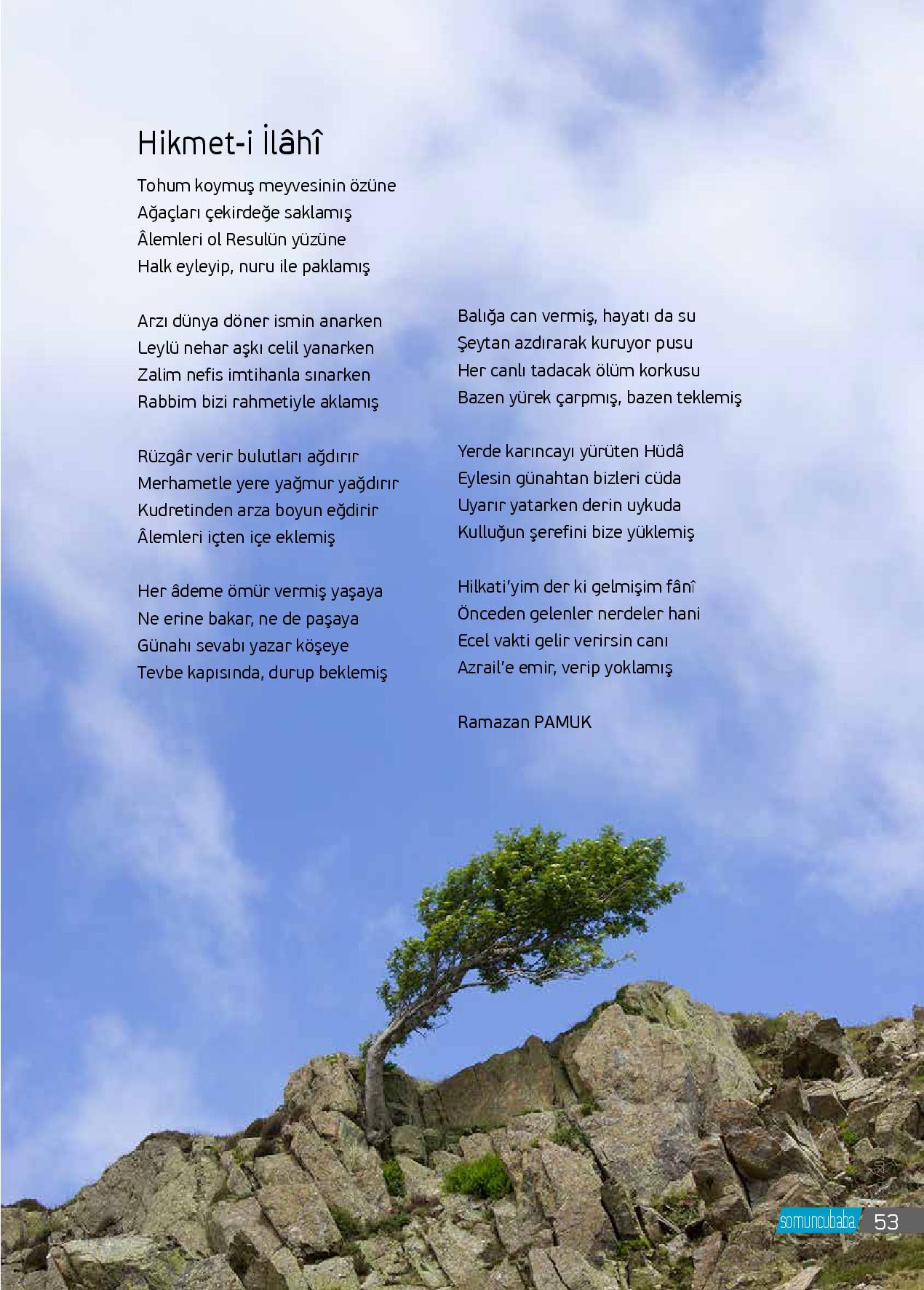 Tohum koymuş meyvesinin özüneAğaçları çekirdeğe saklamışÂlemleri ol Resulün yüzüneHalk eyleyip, nuru ile paklamışArzı dünya döner ismin anarkenLeylü nehar aşkı celil yanarkenZalim nefis imtihanla sınarkenRabbim bizi rahmetiyle aklamışRüzgâr verir bulutları ağdırırMerhametle yere yağmur ...