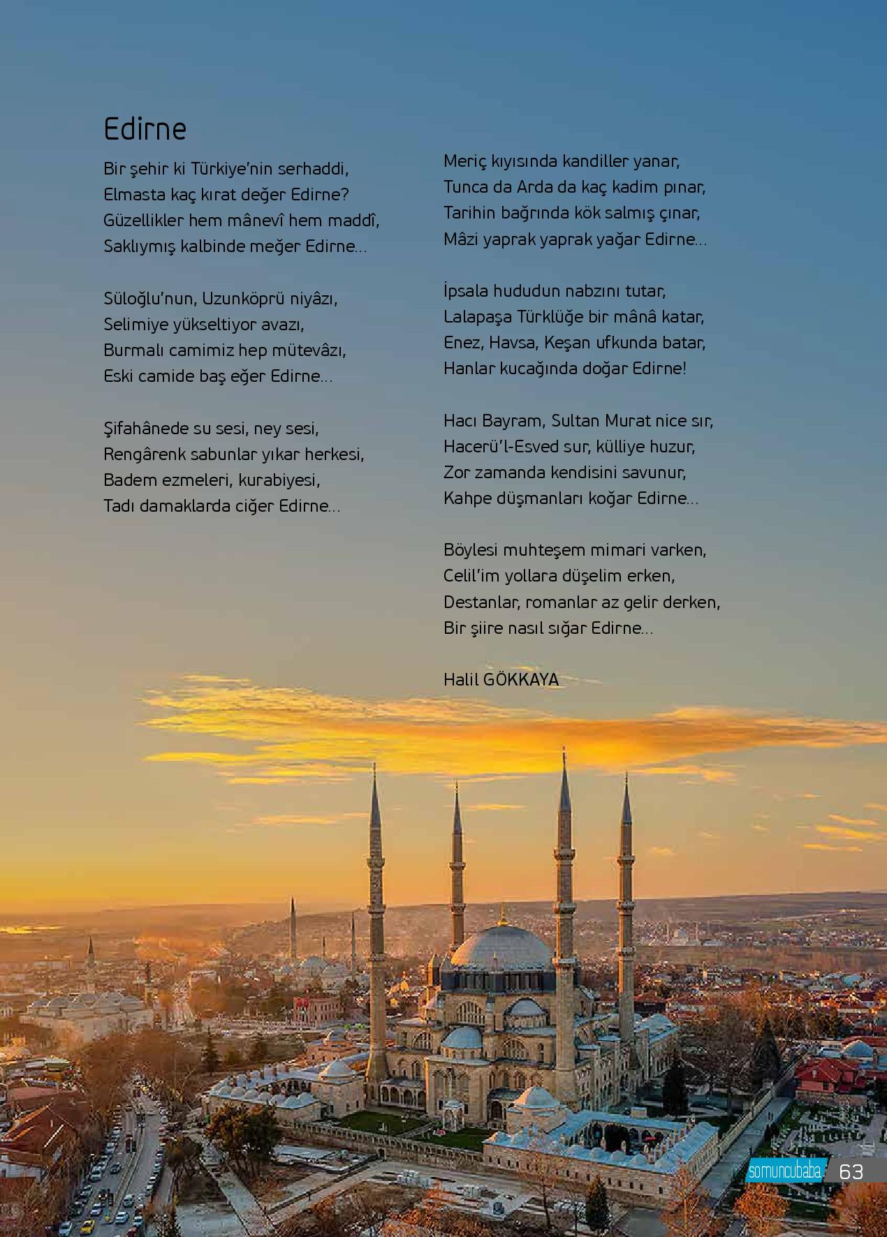 Bir şehir ki Türkiye’nin serhaddi,Elmasta kaç kırat değer Edirne?Güzellikler hem manevi hem maddi,Saklıymış kalbinde meğer Edirne…Süloğlu’nun, Uzunköprü niyazı,Selimiye yükseltiyor avazı,Burmalı camimiz hep mütevazı,Eski camide baş eğer Edirne…Şifahanede su sesi, ney sesi,Rengarenk sabunlar yı...