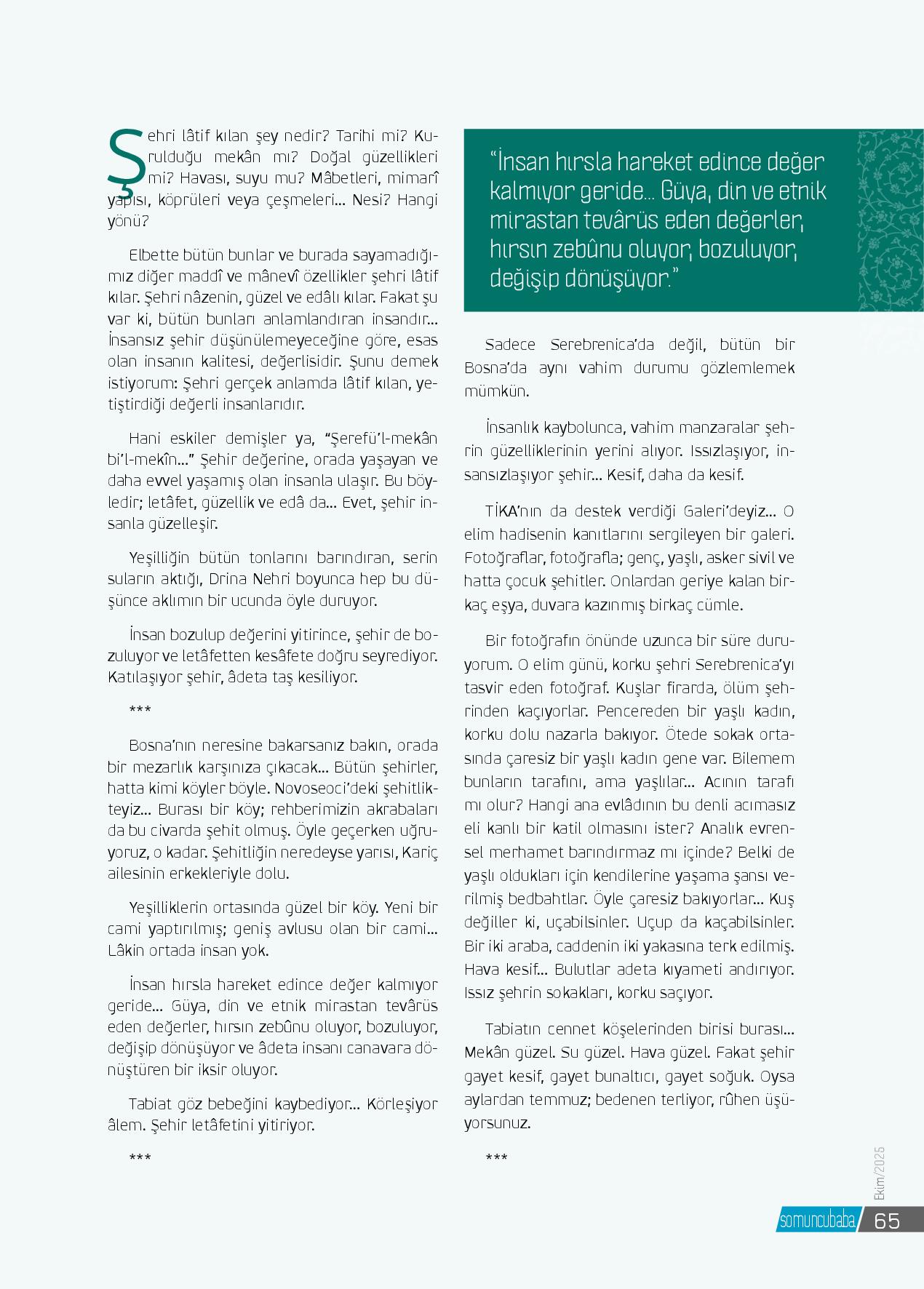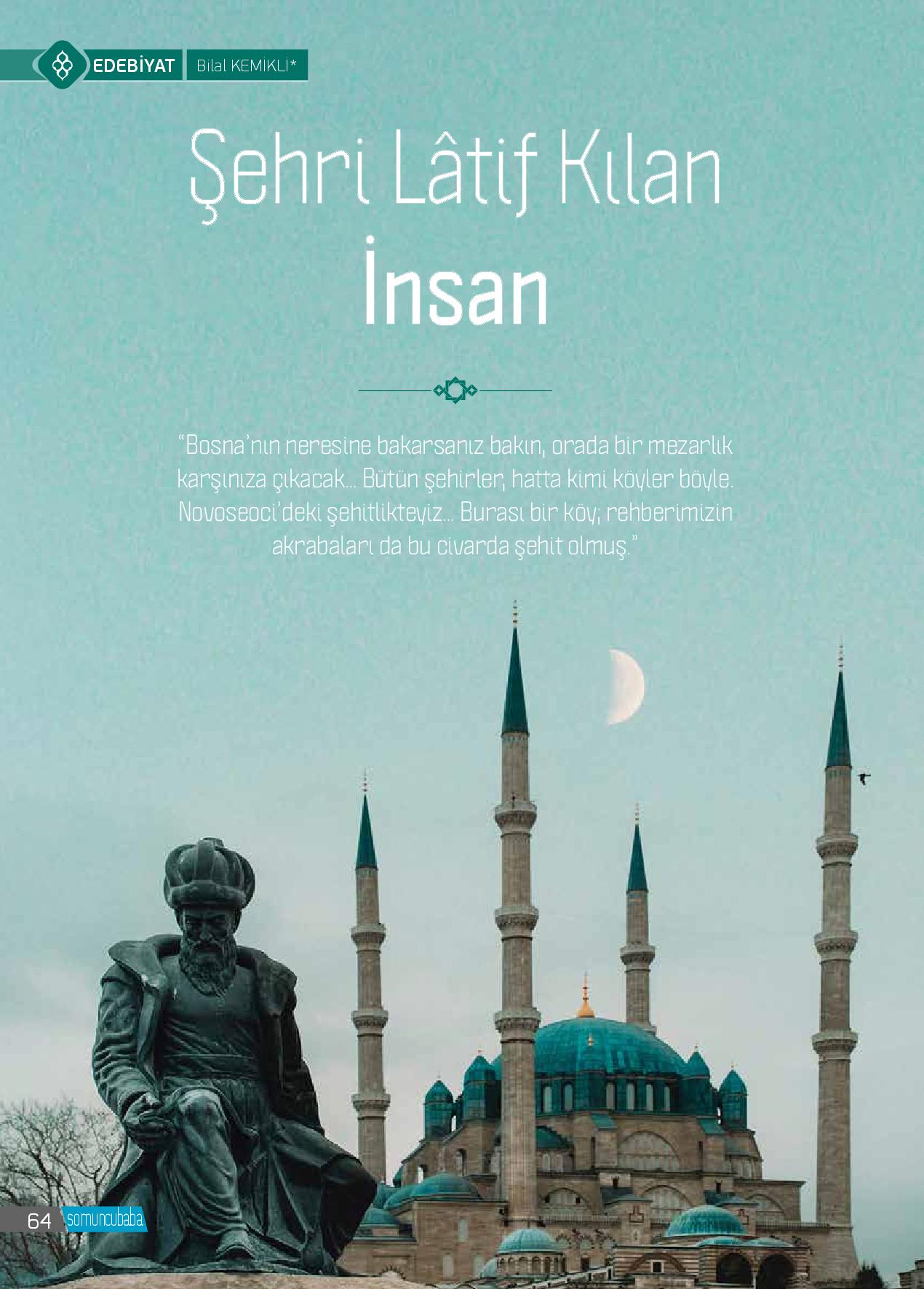 Şehri lâtif kılan şey nedir? Tarihi mi? Kurulduğu mekân mı? Doğal güzellikleri mi? Havası, suyu mu? Mâbetleri, mimarî yapısı, köprüleri veya çeşmeleri… Nesi? Hangi yönü?Elbette bütün bunlar ve burada sayamadığımız diğer maddî ve mânevî özellikler şehri lâtif kılar. Şehri nâzen...