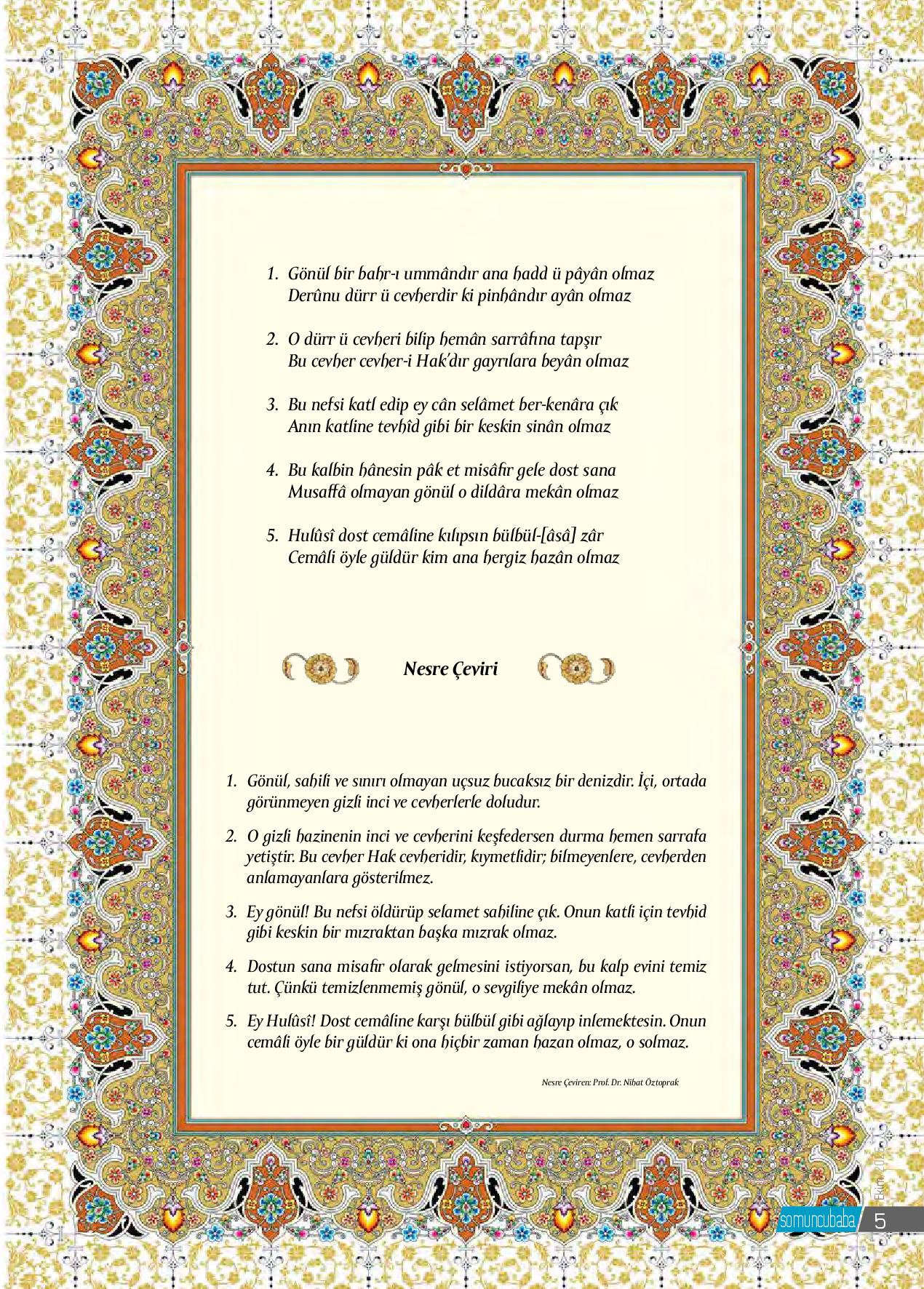 1. Gönül bir bahr-ı ummândır ana hadd ü pâyân olmaz Derûnu dürr ü cevherdir ki pinhândır ayân olmaz2. O dürr ü cevheri bilip hemân sarrâfına tapşır Bu cevher cevher-i Hak’dır gayrılara beyân olm...