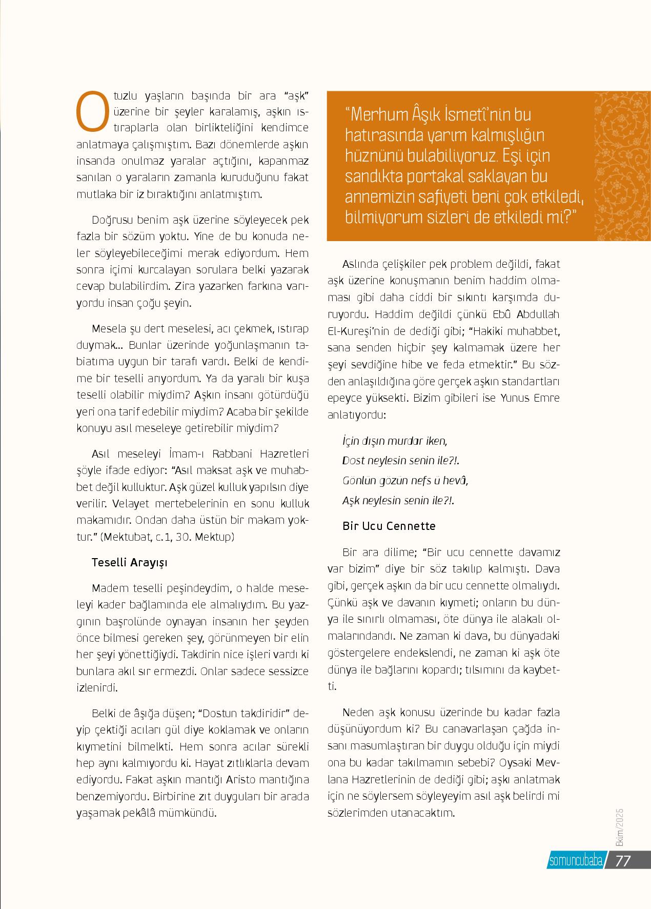 Otuzlu yaşların başında bir ara “aşk” üzerine bir şeyler karalamış, aşkın ıstıraplarla olan birlikteliğini kendimce anlatmaya çalışmıştım. Bazı dönemlerde aşkın insanda onulmaz yaralar açtığını, kapanmaz sanılan o yaraların zamanla kuruduğunu fakat mutlaka bir iz bıraktığını a...