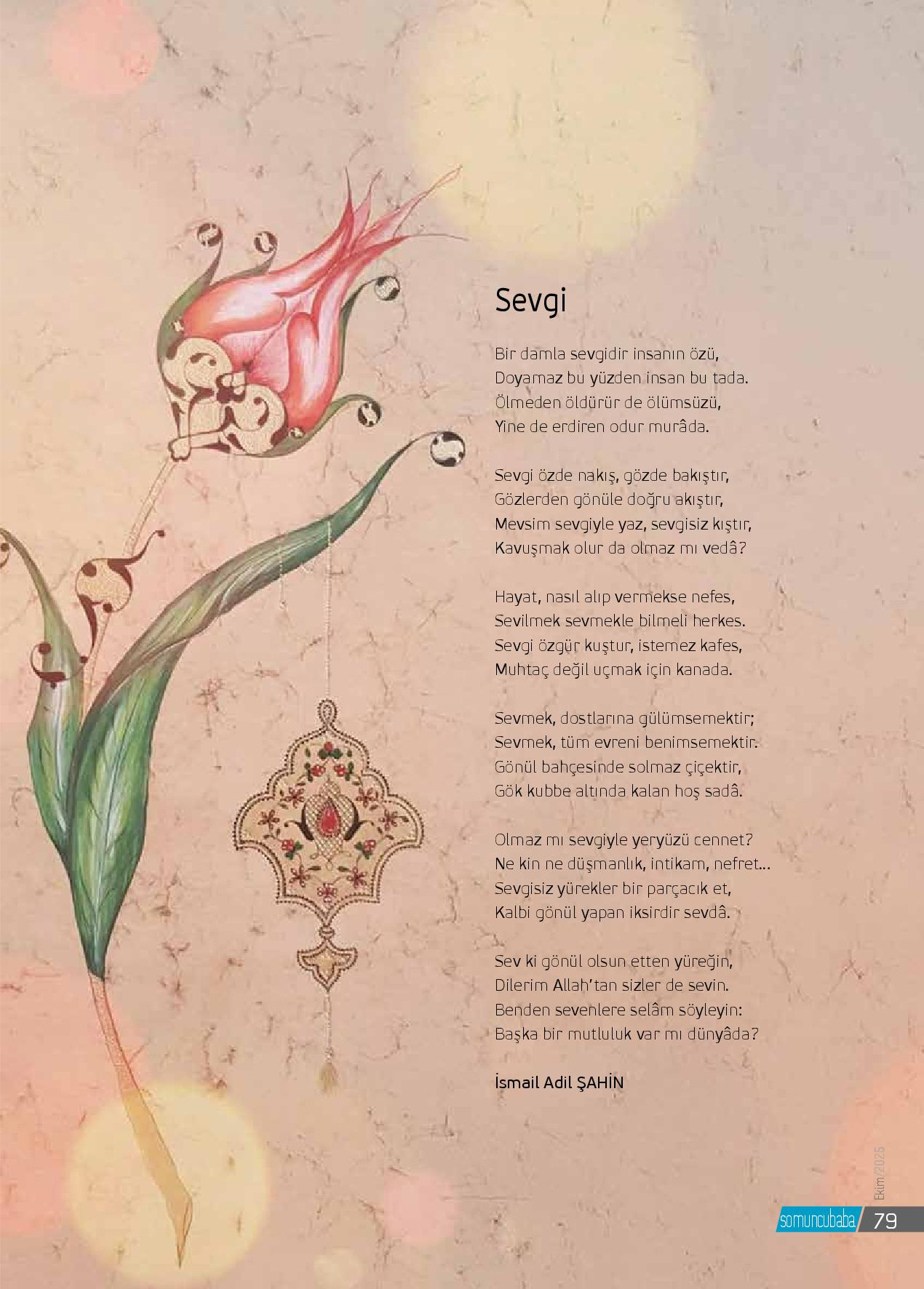 Bir damla sevgidir insanın özü,Doyamaz bu yüzden insan bu tada.Ölmeden öldürür de ölümsüzü,Yine de erdiren odur murâda.Sevgi özde nakış, gözde bakıştır,Gözlerden gönüle doğru akıştır,Mevsim sevgiyle yaz, sevgisiz kıştır,Kavuşmak olur da olmaz mı vedâ?Hayat, nasıl alıp vermekse nefes,Sevilmek se...