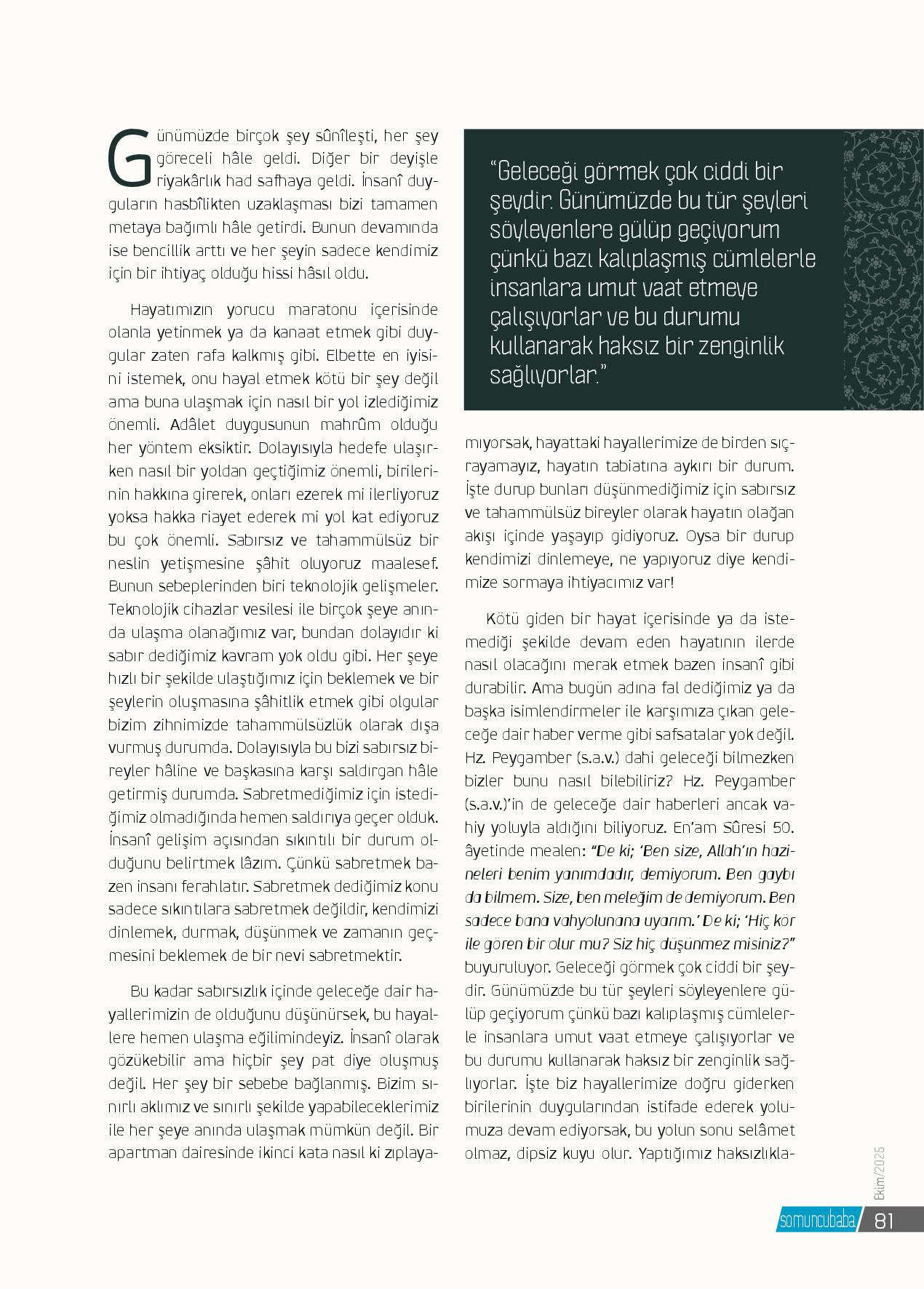“Kötü giden bir hayat içerisinde ya da istemediği şekilde devam eden hayatının ilerde nasıl olacağını merak etmek bazen insanî gibi durabilir. Ama bugün adına fal dediğimiz ya da başka isimlendirmeler ile karşımıza çıkan geleceğe dair haber verme gibi safsatalar yok değil. Hz. Peygam...