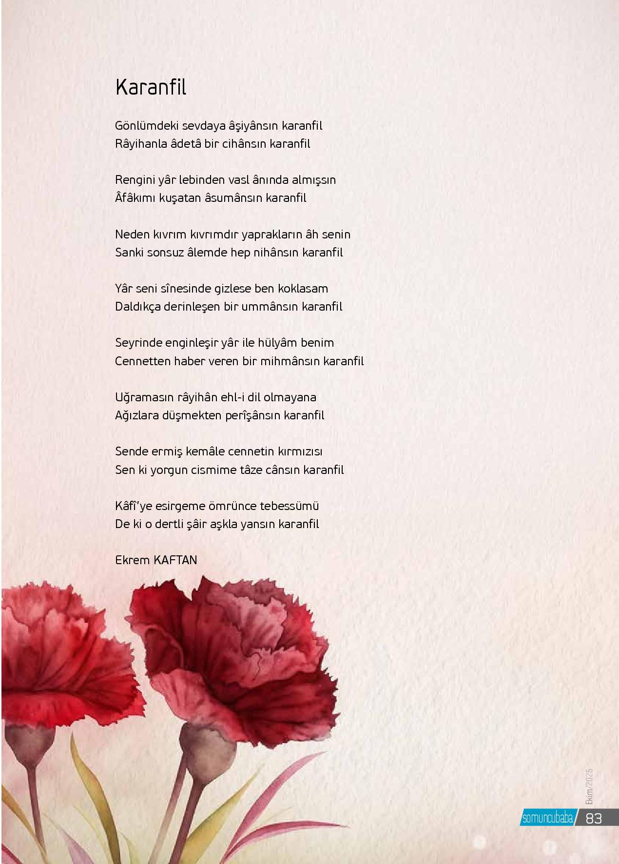 Gönlümdeki sevdaya âşiyânsın karanfilRâyihanla âdetâ bir cihânsın karanfilRengini yâr lebinden vasl ânında almışsınÂfâkımı kuşatan âsumânsın karanfilNeden kıvrım kıvrımdır yaprakların âh seninSanki sonsuz âlemde hep nihânsın karanfilYâr seni sînesinde gizlese ben koklasamDaldıkça derinleşen ...
