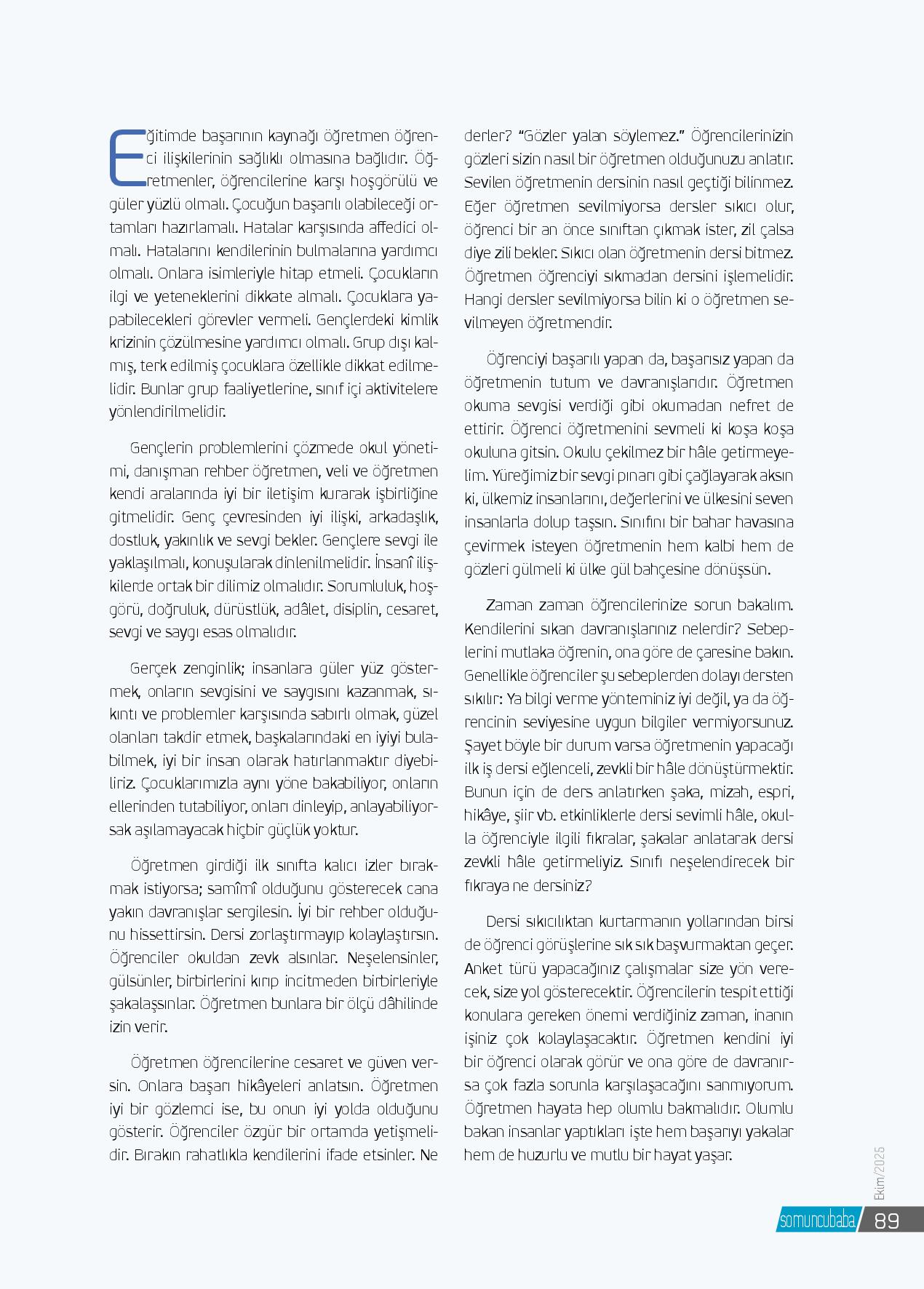 Eğitimde başarının kaynağı öğretmen öğrenci ilişkilerinin sağlıklı olmasına bağlıdır. Öğretmenler, öğrencilerine karşı hoşgörülü ve güler yüzlü olmalı. Çocuğun başarılı olabileceği ortamları hazırlamalı. Hatalar karşısında affedici olmalı. Hatalarını kendilerin...